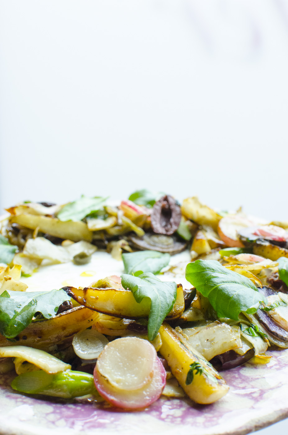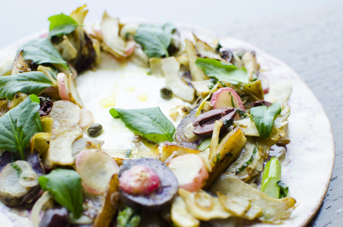 Für die Zubereitung der Artischocken Latexhandschuhe anziehen, damit sich die Hände nicht schwarz färben. Die Artischocken schälen und in Zitronenwasser einlegen. Die Kartoffeln kochen und in schmale Scheiben schneiden. Anschließend gemeinsam mit den Artischocken, Zwiebeln, Knoblauch, Sauerkleeknollen, Kerbelknollen und grünem Spargel in Olivenöl anbraten. Die Oliven und Kräuter dazu geben und mit Salz und Pfeffer würzen (nur wenig, da die Kräuter und das Gemüse angeröstet schon sehr würzig sind). Mit Crème Frâiche und Bachkresse garnieren.