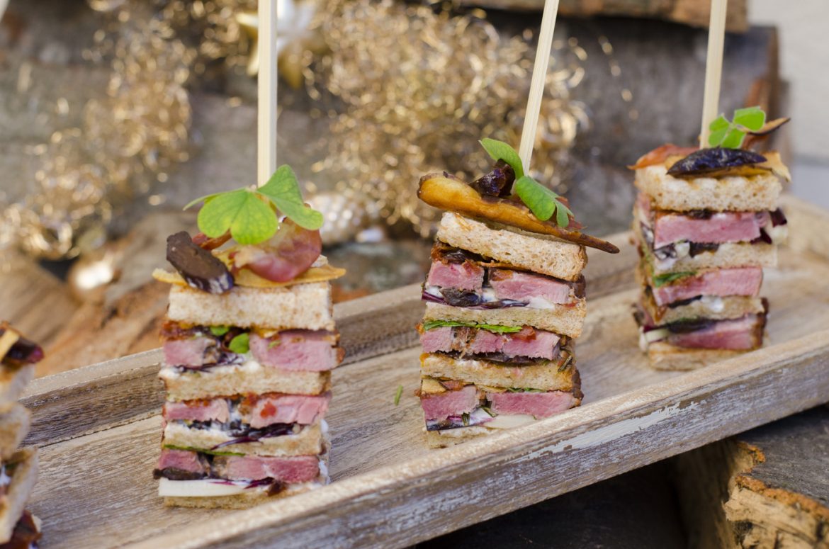 Die Entenbrust zuschneiden und das Fett einschneiden(siehe Foto). Die Entenbrust ca. 2 Minuten auf beiden Seiten scharf anbraten und bei 175° im Rohr 5 Minuten fertig garen. Danach das Fleisch dünn aufschneiden und die knusprigen Toastscheiben mit allen Zutaten belegen und aufeinander schichten.