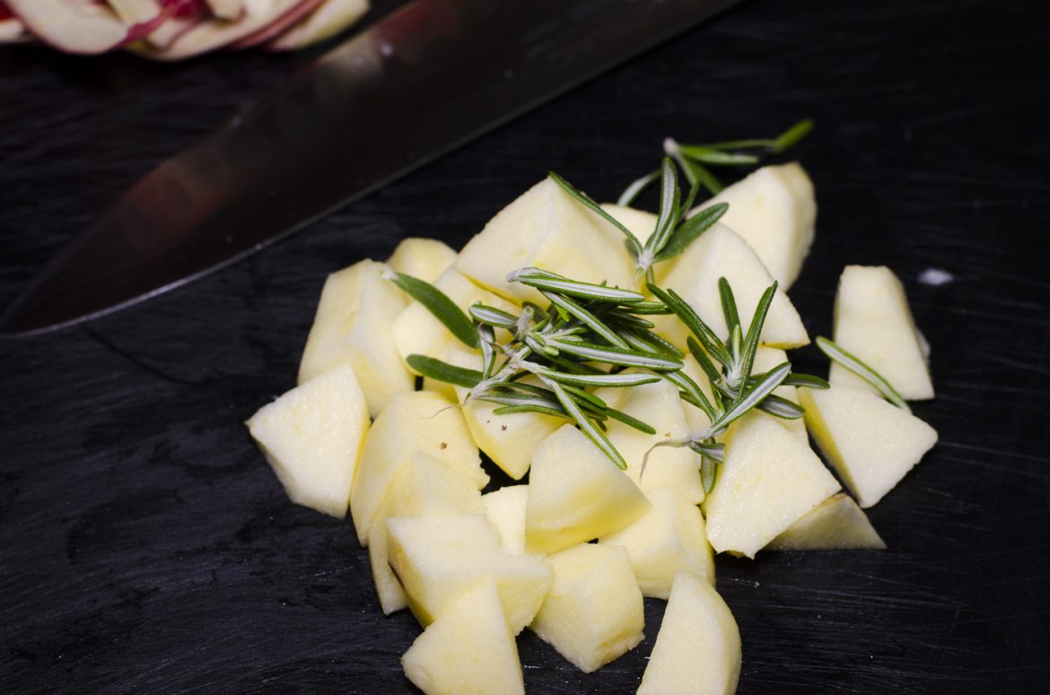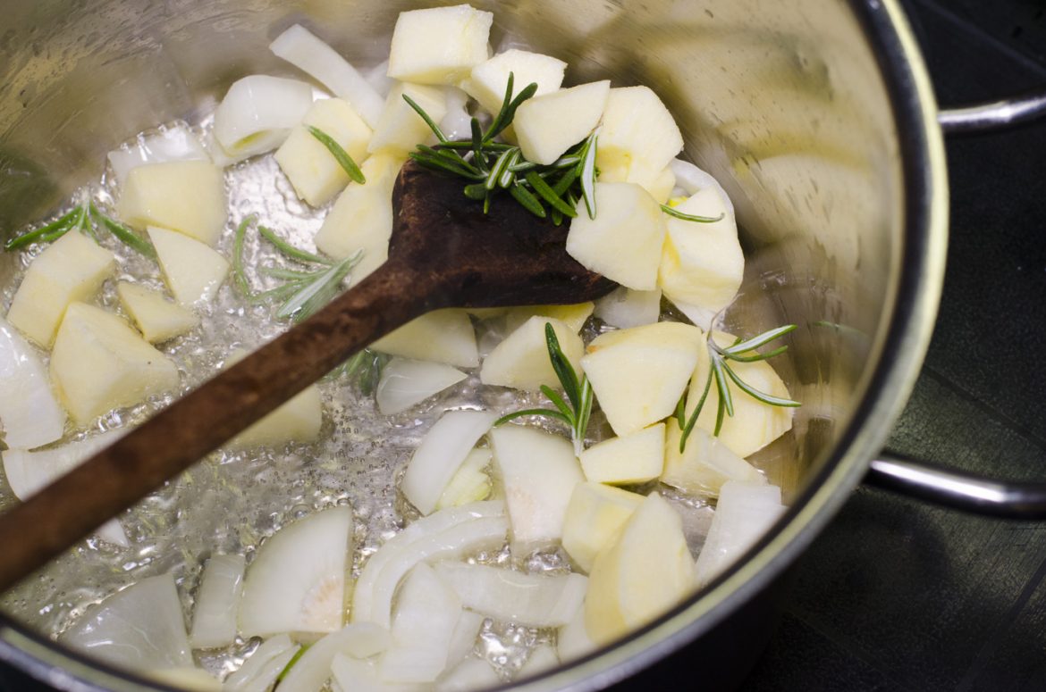 Die Zutaten für das Apfel-Ingwermus einkochen und anschließend mixen.