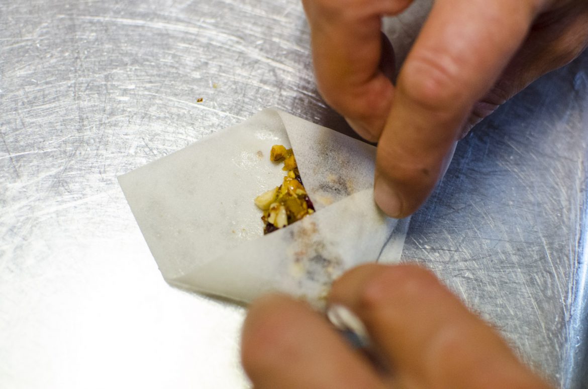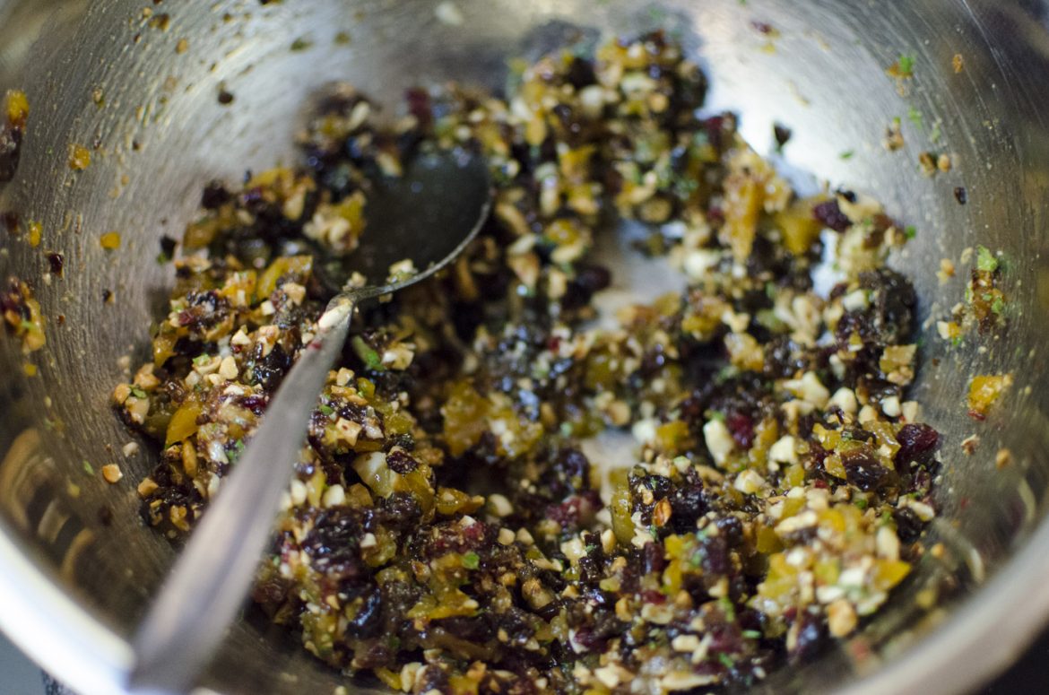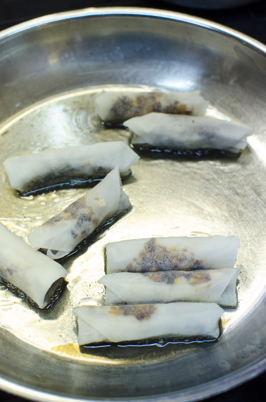 Das Dörrobst und die Nüsse fein schneiden und hacken. Dann mit Zimt, Agavendicksaft und Zitronensaft marinieren. Die fein gehackte Minze dazu geben. Das Reisblatt vierteln (siehe Foto), 1 EL der Füllung in die Mitte geben, die Ränder mit Wasser bepinseln und straff eindrehen. Die Rollen in einer Pfanne mit Öl von allen Seiten goldgelb anbraten.