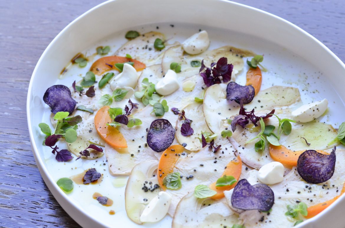 Die Perlhuhnbrüste mit Salz und Pfeffer würzen (je nach Geschmack mit Räuchersalz) und auf der Hautseite in einer Pfanne mit Olivenöl anbraten. Anschließend bei Zimmertemperatur abkühlen lassen und dünn (siehe Foto) aufschneiden. Die Marillen oder Zwetschgen (je nach Saison) ebenfalls dünn aufschneiden und entweder roh oder alternativ in Butter oder Rapsöl eingekocht zubereiten. Die Steinpilze (oder Champignons) hauchdünn aufschneiden (mit Aufschnittmaschine oder feine Hobel), mit Salz würzen und Olivenöl beträufeln. Nun alles auf einem Teller mit Créme Frâiche, Chips und Kresse garnieren.