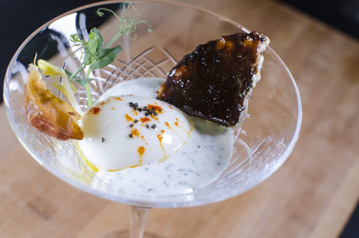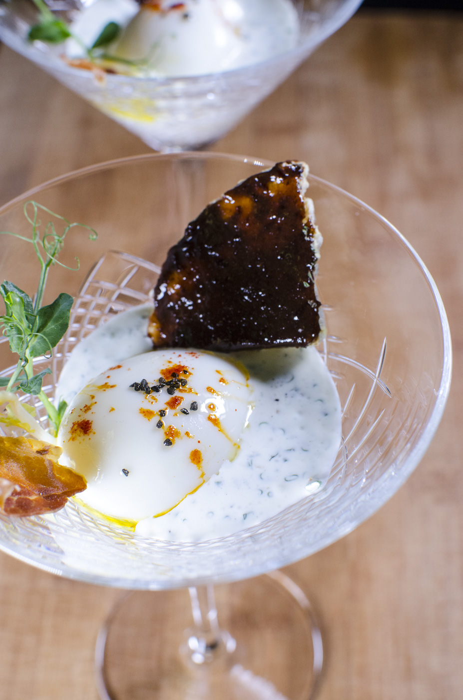 Die Eier drei Minuten lang kochen, rausnehmen und schälen. Man kann die Eier zwar abschrecken, damit sie nicht zu heiß sind und man sich nicht verbrennt, aber sie lassen sich dadurch nicht generell besser schälen. Wenn ein Ei besonders frisch ist, lässt es sich schwieriger schälen. Das Ei noch warm ins Glas geben und den Sauerrahm (Zimmertemperatur) mit gemischten Kräutern (wichtig: Schnittlauch) und Speckbrösel verrühren. Maiswaffeln (dürfen auch gewürzt sein) mit Powidl bestreichen.