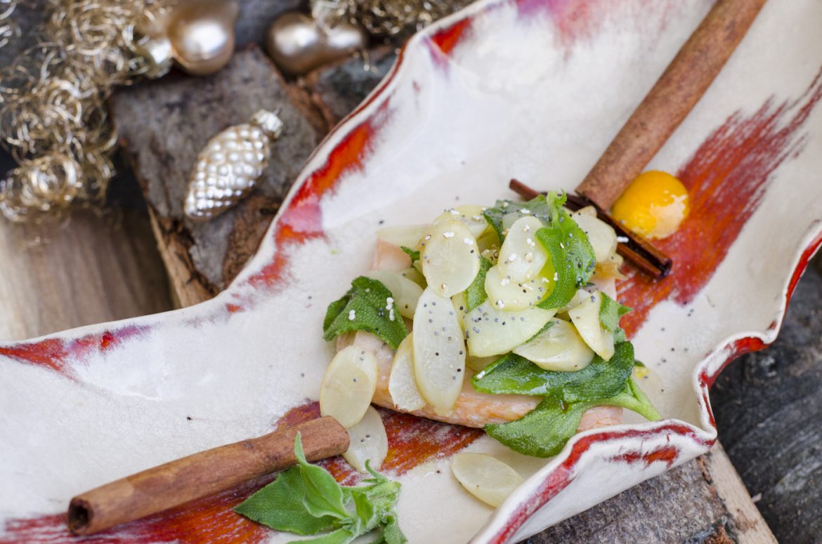Den Eismeersaibling 5 Minuten bei 90° dämpfen oder in der Pfanne auf der Hautseite knusprig braten. Die Schwarzwurzel schälen und in Zitronen-Salzwasser bissfest kochen und anschließend in Scheiben schneiden. Die Äpfel schälen und in Spalten schneiden. Die Schwarzwurzel mit Knoblauch, Zimt und Apfel anschwitzen, würzen und erst zum Schluss das Eiskraut beimengen. Anschließend das Gemüse auf dem Teller anrichten und den gedämpften Saibling darauf setzen. Mit Mohn, Kräutern und gepopptem Amarant garnieren.