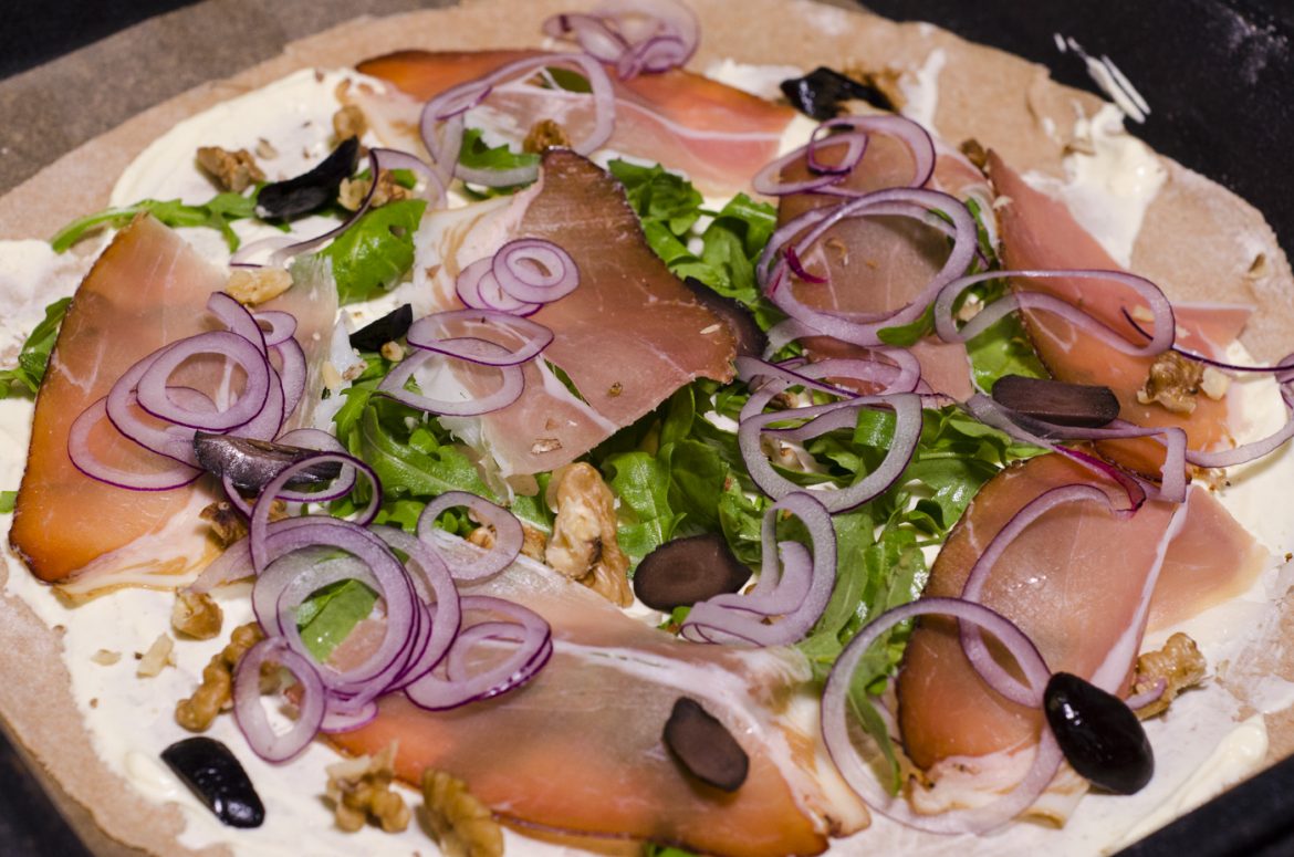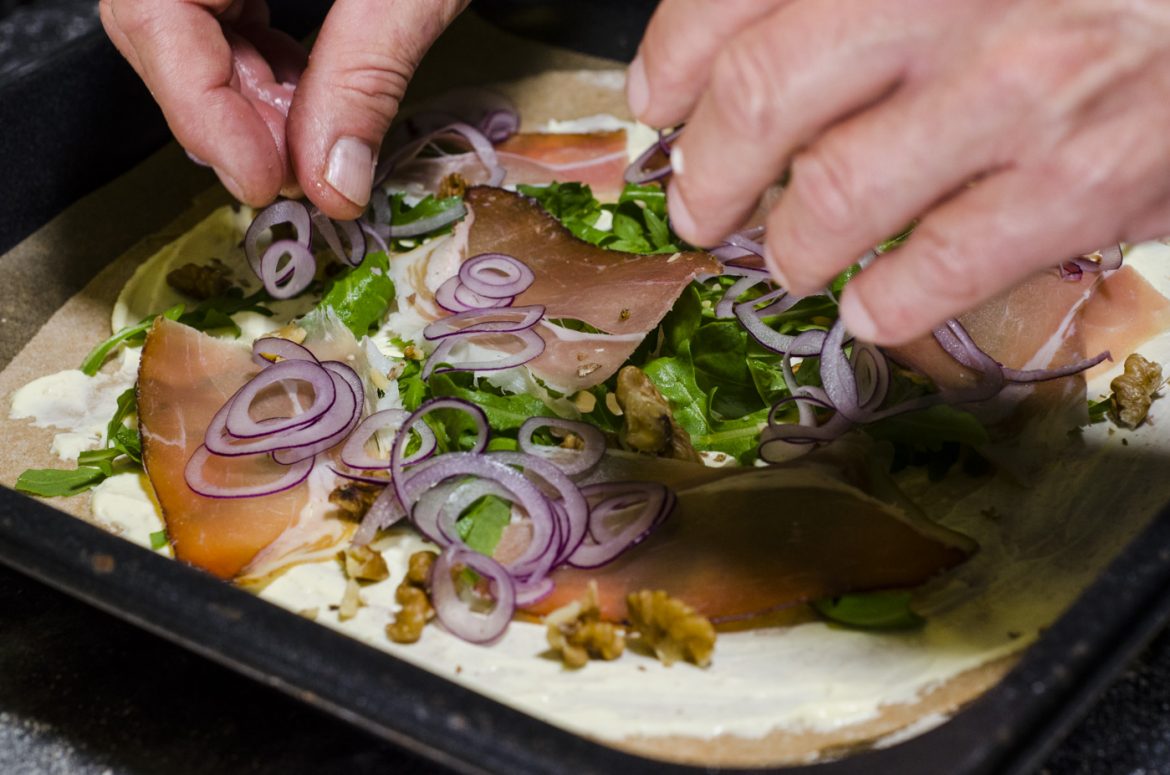 Flammkuchen mit Rucola, Walnüssen, Rohschinken und ZwiebelnDieser köstliche Dinkelvollkorn-Flammkuchen (Rezept für 4 Pers.) ganz einfach zuhause selbst gemacht! In wenigen Tagen startet “Essen Lieben” vom Salzburger Spitzenkoch Andreas Kaiblinger. Einfache Rezepte zum Nachkochen für eine gesunde und ausgewogene Ernährung. – www.essenlieben.com – Du kannst Dich jetzt schon für den kostenlosen Newsletter anmelden und wirst so kein Rezept verpassen! 🙂