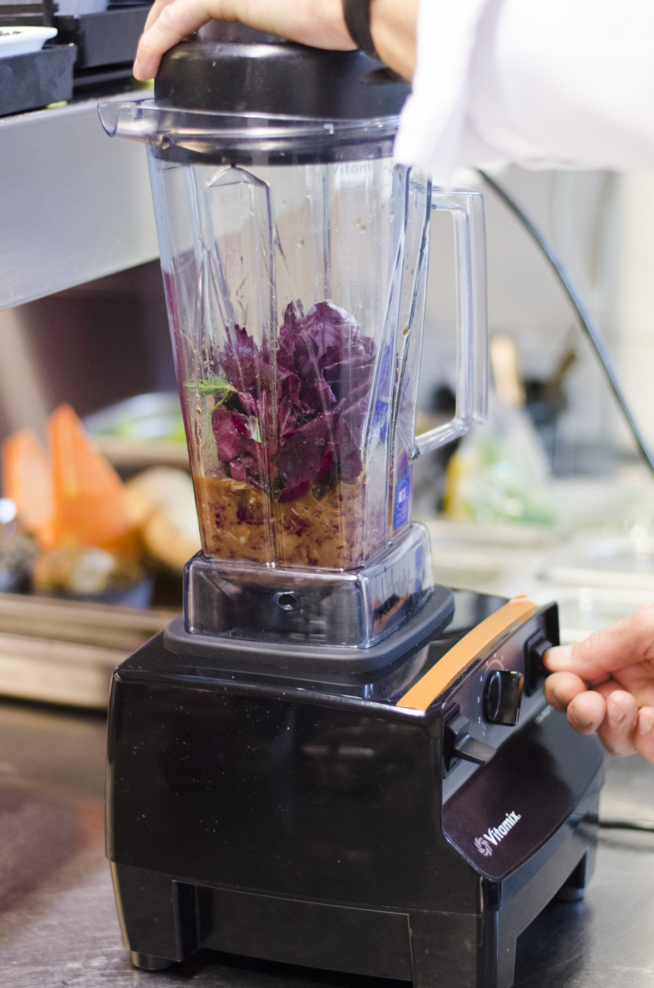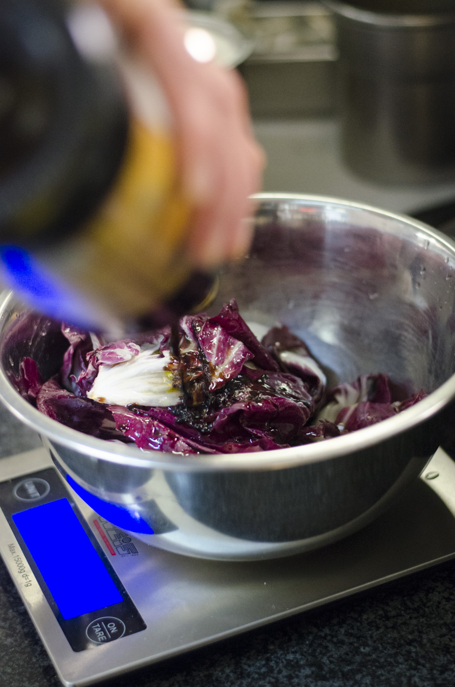 Den übrig gebliebenen Raddichio (160g) ebenfalls in handwarmem Wasser einlegen, abseihen und mit 40ml Balsamico, 60ml Agavendicksaft (oder Honig), 40ml Olivenöl, Rosmarin und Knoblauch fein mixen.