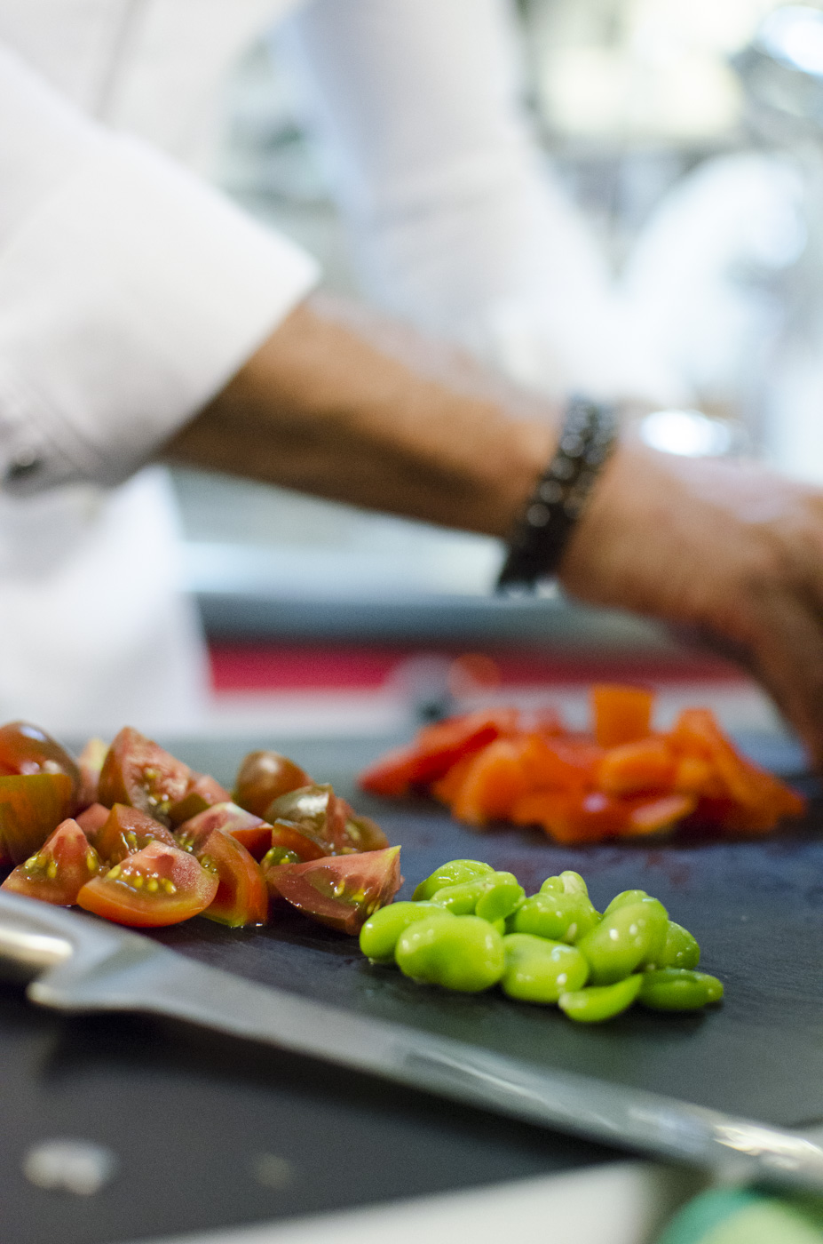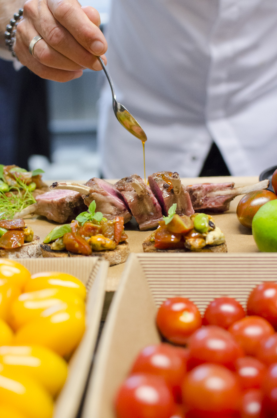 Die Lammkronen mit Salz und Pfeffer würzen und grillen, so dass sie von außen eine schöne Farbe bekommen und innen noch zart rosa sind (siehe Foto). Die ausgebrochenen und gekochten Miesmuscheln gemeinsam mit gekochten Saubohnen und den geviertelten Tomaten in der Pfanne mit Olivenöl schwenken und würzen. Die Brotscheiben mit Olivenöl bestreichen und ebenfalls auf dem Grill anrösten.