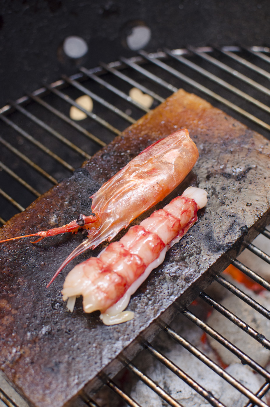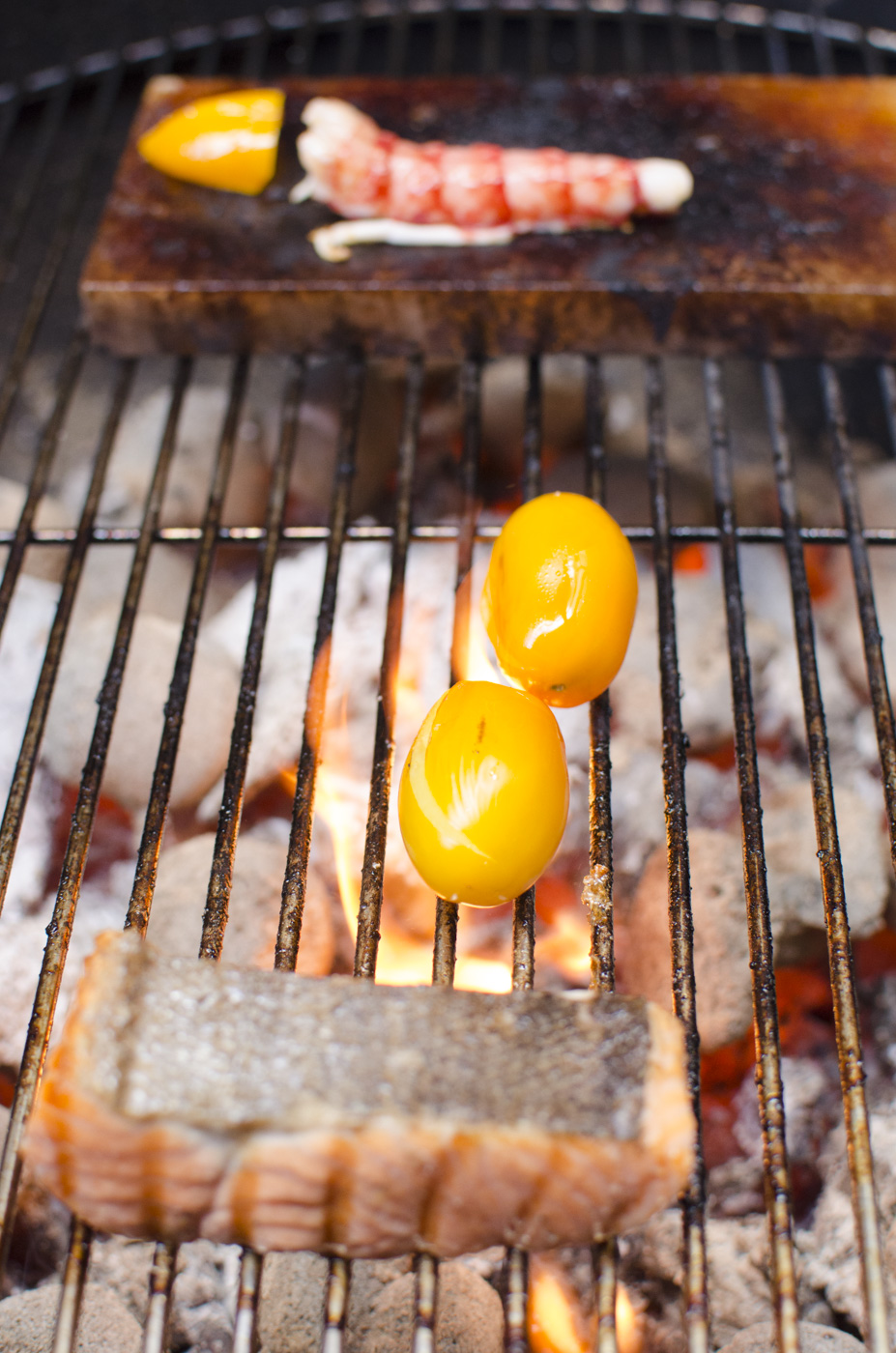Die Zutaten für die Glasur sirupartig einkochen. Den Lachs und die Langostinos mit Salz und Pfeffer würzen und grillen. Anschließend mit der Glasur bestreichen. Die Cocktailtomaten ebenfalls würzen und auf den Grill geben.