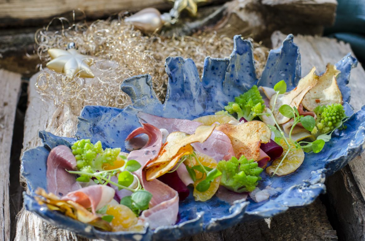 Gelbe Rüben in dünne Scheiben schneiden und im Gewürzsud weich kochen danach die rote Rübe auf gleiche Weise zubereiten. Die Mandarinen schälen und in lauwarmes Wasser einlegen, danach die Fasern entfernen. Kleine Röschen vom Romanesco in Salzwasser bissfest kochen und in Eiswasser abschrecken. In Butteröl (schwedisches Rapsöl) kurz anbraten und mit Salz, Pfeffer, Agavendicksaft und einer Messerspitze Zimt würzen. Danach die Flugente dünn aufschneiden.