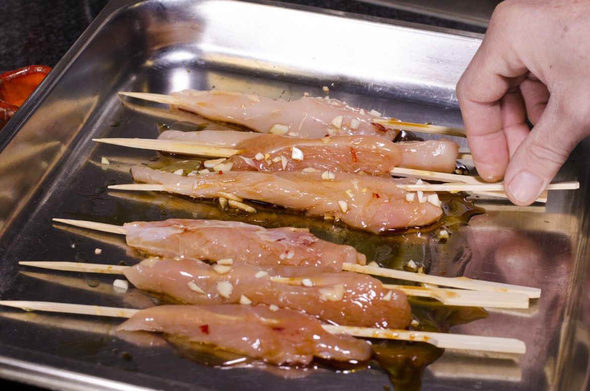 Die Hühnerbrüste in Finger dicke Streifen schneiden und auf Holzspieße stecken. Mit Salz, Knoblauch, Chili, Distelöl, Curry, Ingwer, schwarzem Sesam, Sojasauce und Agavendicksaft marinieren. Auf beiden Seiten gleichmäßig anbraten. Beim Braten das Fleisch etwas andrücken, dann wird es noch besser.