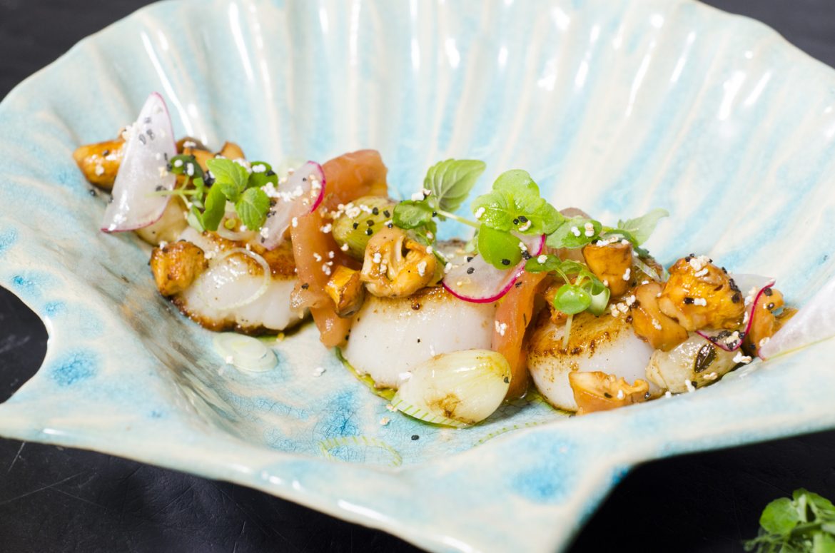 Das Olivenöl in einer beschichteten Pfanne erhitzen und dann die Jakobsmuscheln hierin von jeder Seite scharf anbraten und im Anschluss im Backrohr warmstellen.