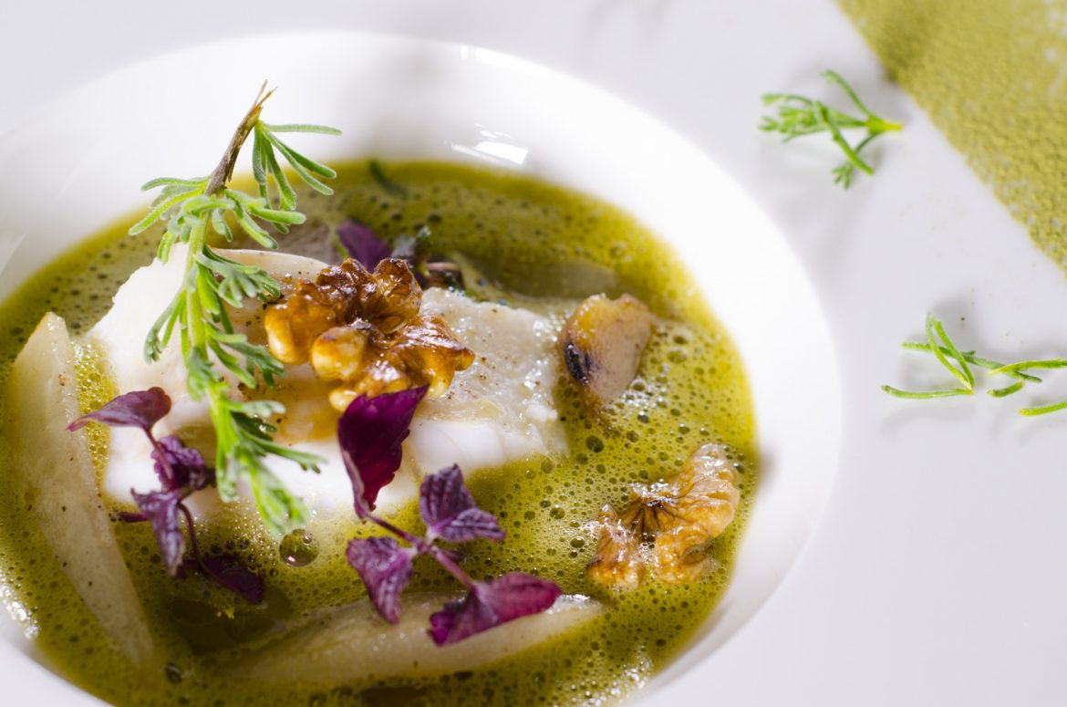 Birne in längliche dünne Stücke schneiden, mit den Maroni und Walnüssen anschwitzen und würzen. Aus der Pfanne nehmen und kurz abstellen. Kabeljaufilet würzen (Salz, Pfeffer) und 10 Minuten lang dämpfen.