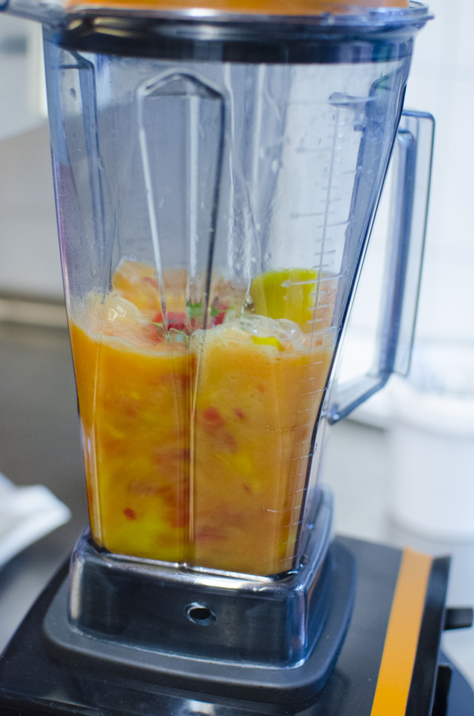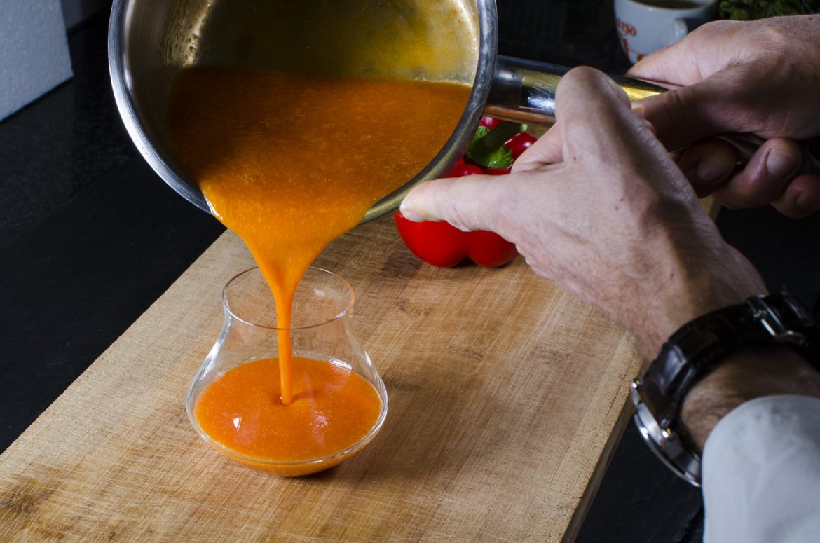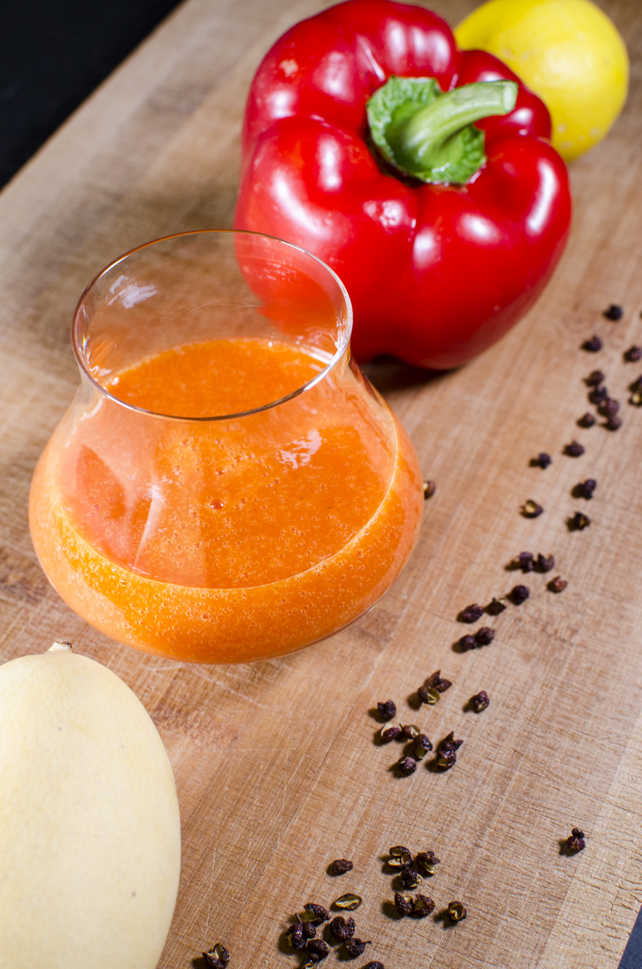 Die reife und faserfreie Mango und Paprika in Würfel schneiden und gemeinsam mit den restlichen Zutaten in den Mixer geben, gut durchmixen und genießen!