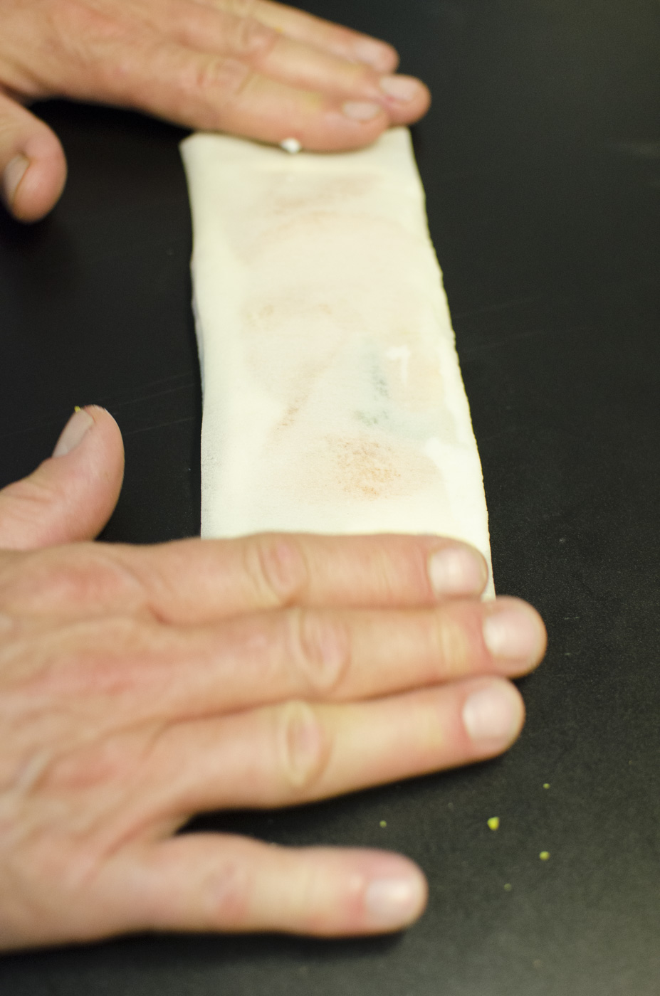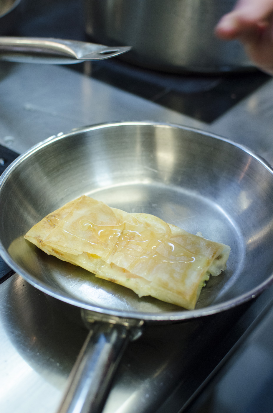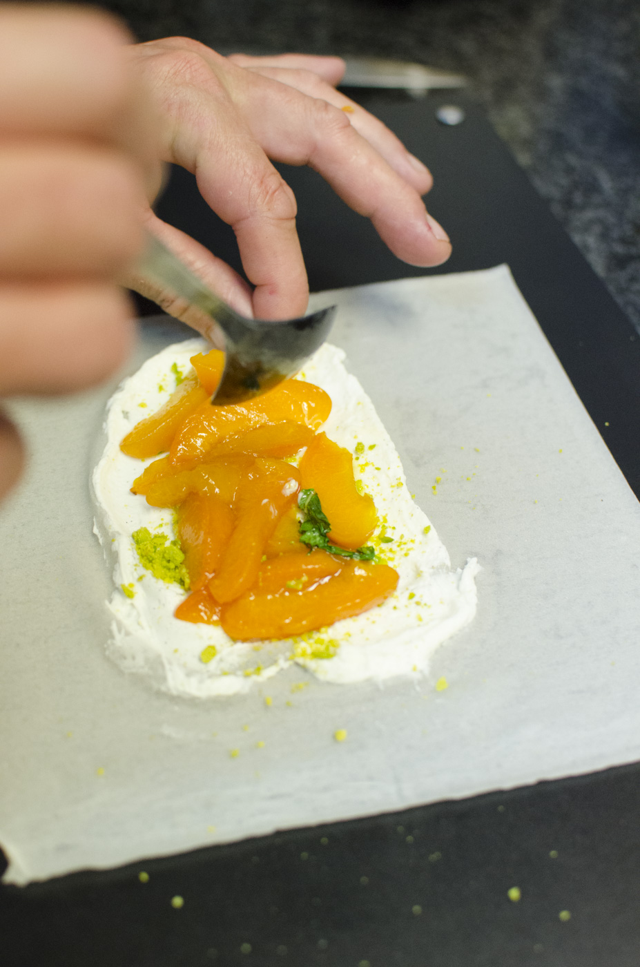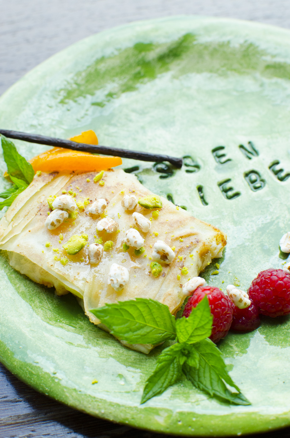 Die Marillen in Spalten schneiden und gemeinsam mit Agavendicksaft, Nelke, Vanille und Sternanis in einem Topf weich schmoren. Die Gewürze rausgeben und die Marillen über den aufgestrichenen Topfen in die Mitte des aufgeklappten Reispapiers geben. Das Reispapier vorher schon rauslegen, damit es auftauen kann und nicht mehr feucht ist. Nun die Seiten überlappen (siehe Foto) und von beiden Seiten gleichmäßig in einer Pfanne mit Olivenöl anbraten und dabei leicht andrücken. Anschließend mit Agavendicksaft bepinseln.