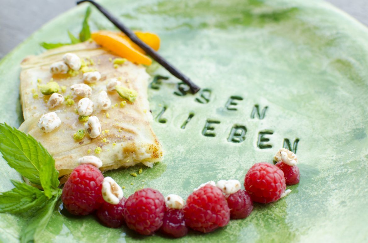 Als Garnitur frische Himbeeren, gehackte Pistazien, Dinkelpops und Minze verenden.