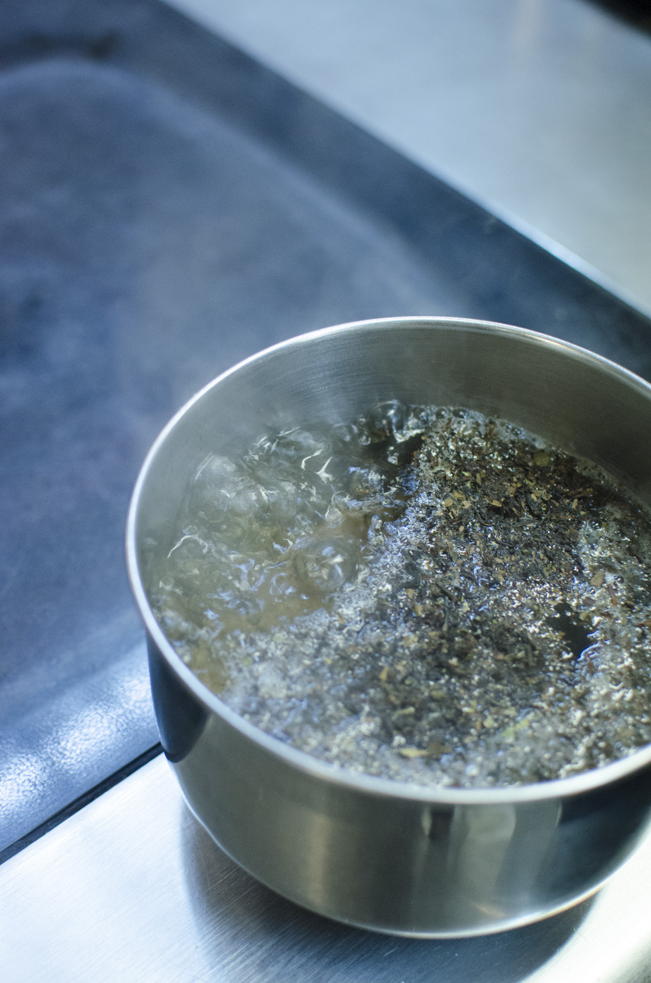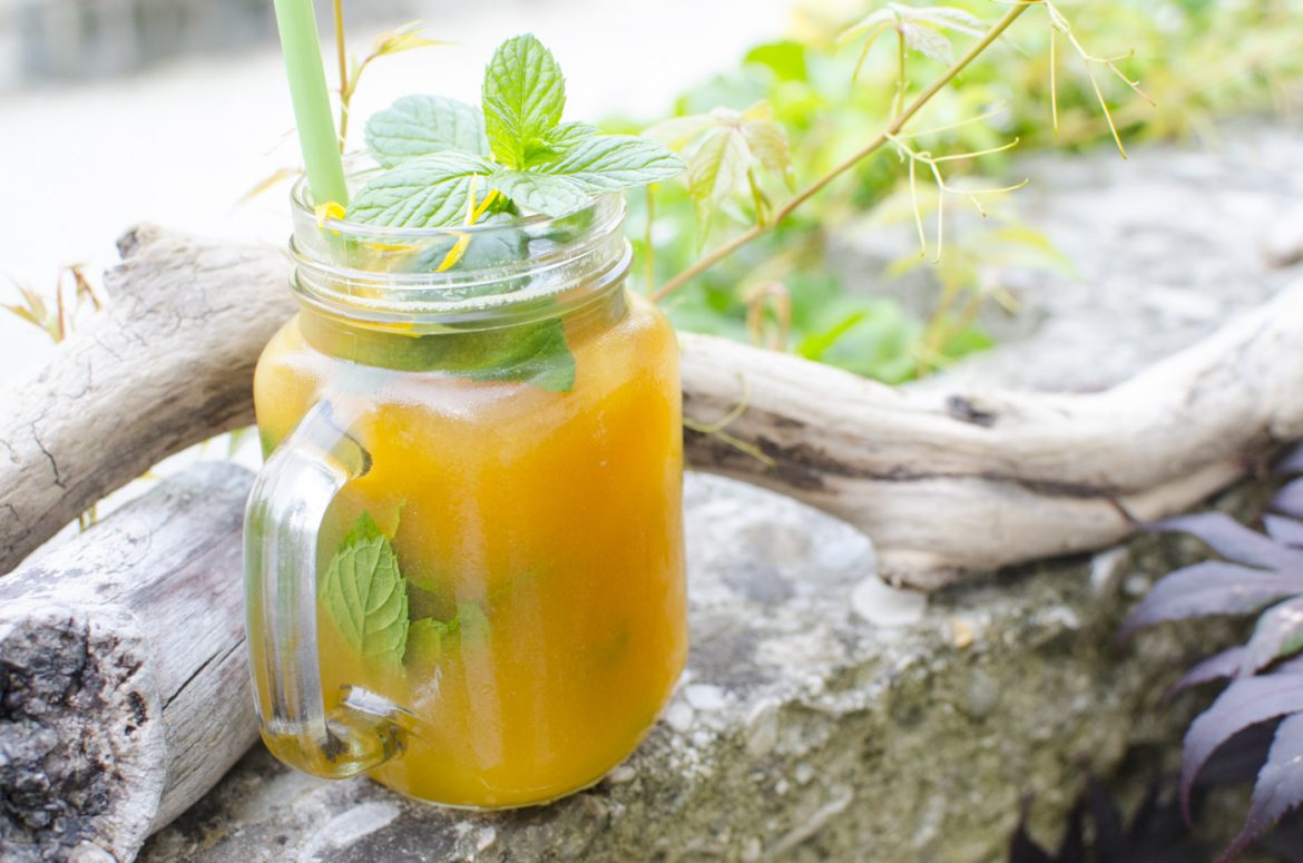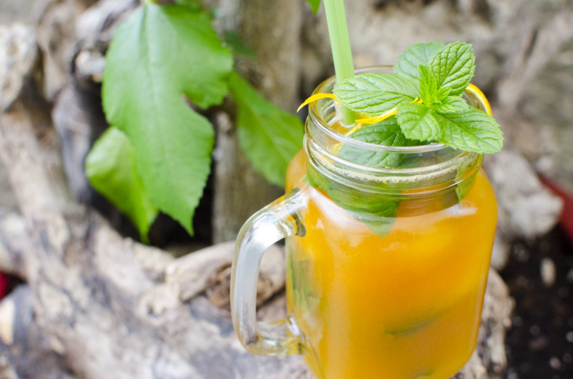 Die Orangen pressen und durch ein Sieb passieren. Anschließend eine Stunde lang auf einem Blech einfrieren. Danach die gefrorene Masse mit einer Spachtel zerkleinern und mit kaltem Schwarztee und Agavendicksaft aufgießen. Je nach Geschmack mit etwas Limettensaft verfeinern und mit Minze garnieren!