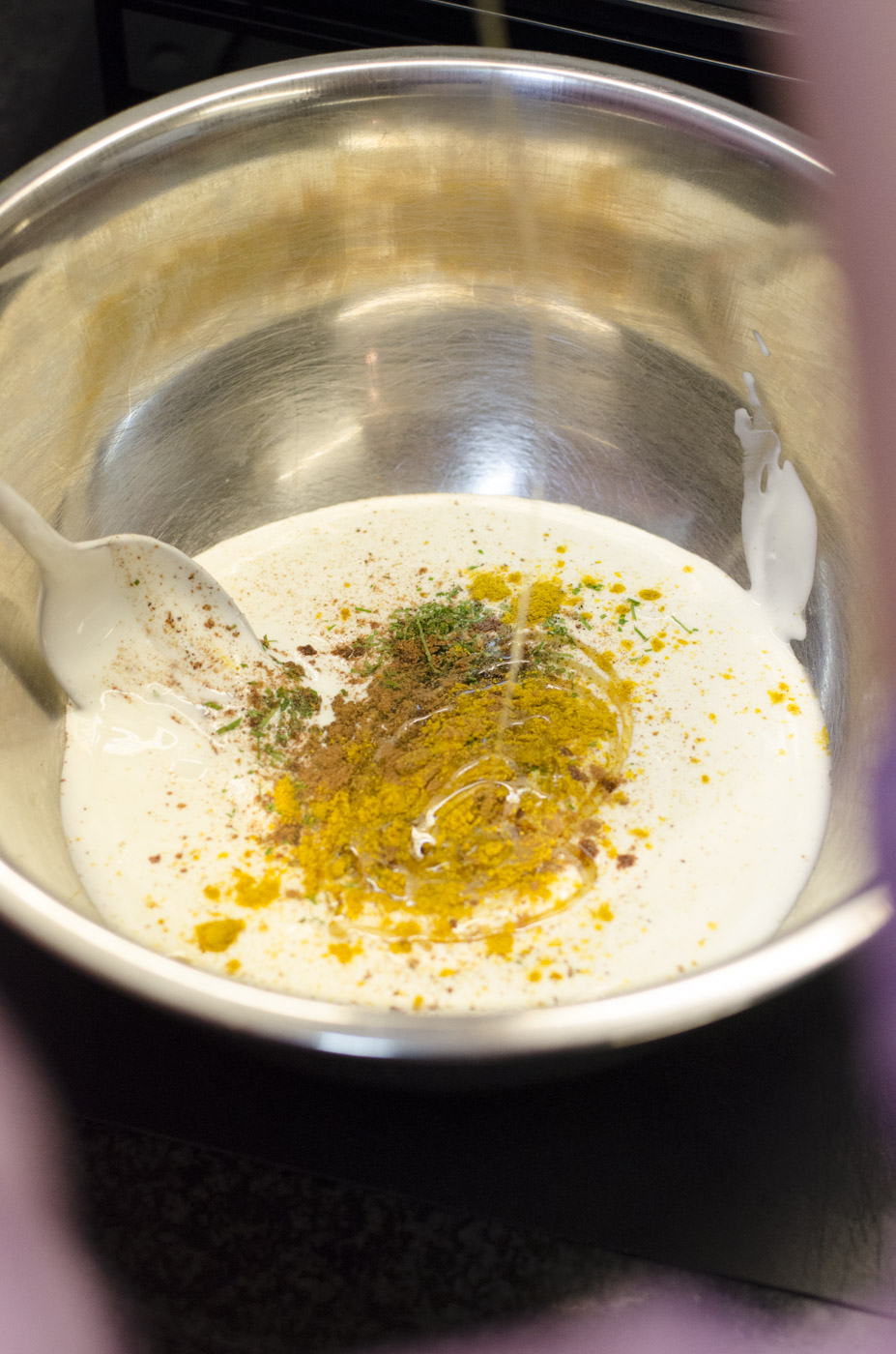 Das Joghurt mit dem Topfen verrühren und mit den restlichen Gewürzen (Kardamom, Zimt, Nelke und Co. reiben) und Zutaten vermischen. Bei dem Curry sparsam sein, damit es nicht zu scharf/würzig wird.