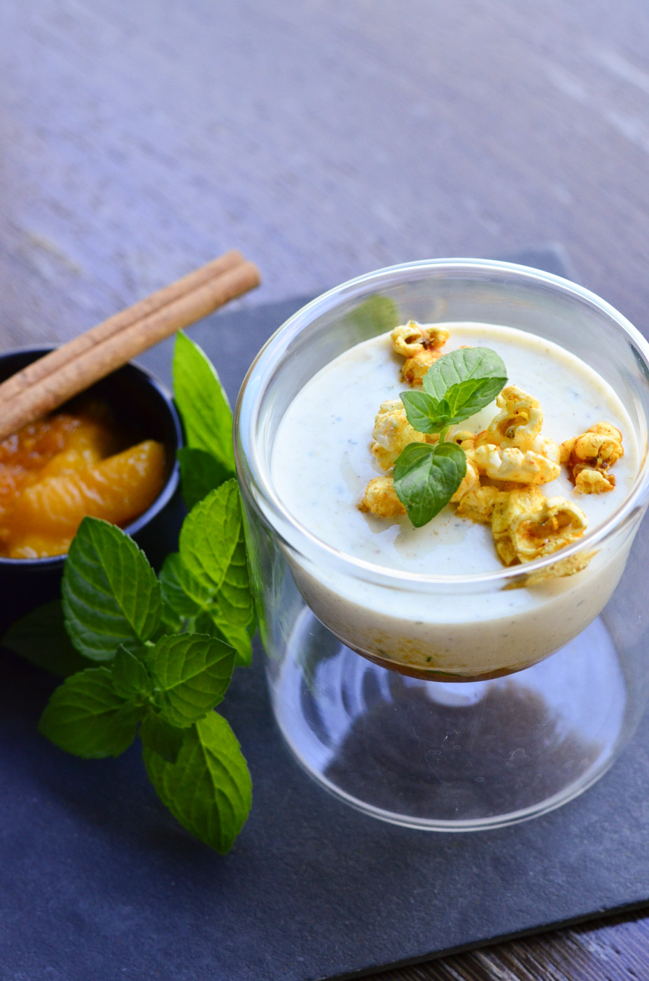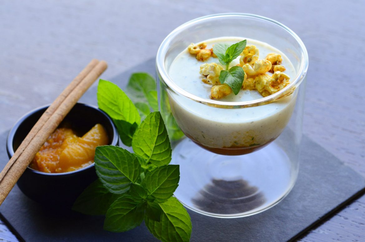In einem Glas zuerst die Marmelade einfüllen und das Joghurt oben drauf geben. Als Garnitur eignen sich Popcorn, Nüsse und Minze.