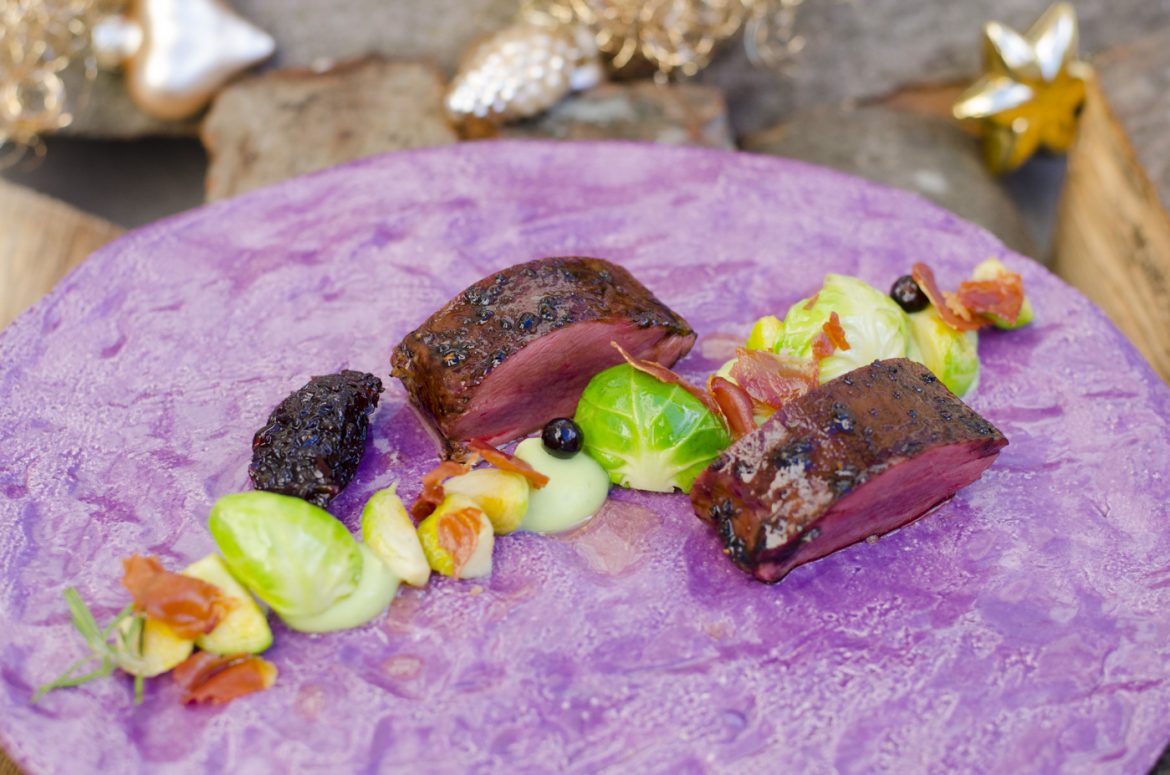 Den Rehrücken mit der Glasur einstreichen und alle Zutaten auf einem Teller anrichten. Mit den getrockneten Speckscheiben und den Kohlsprossenblätter garnieren.