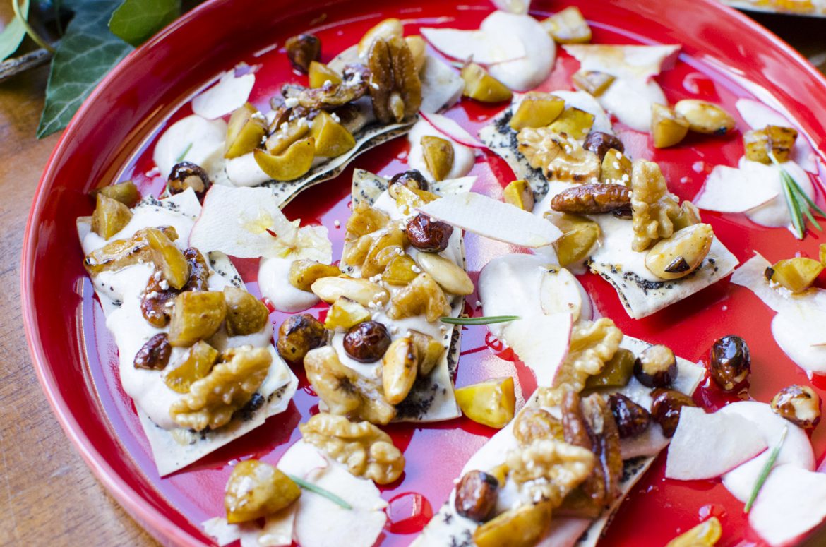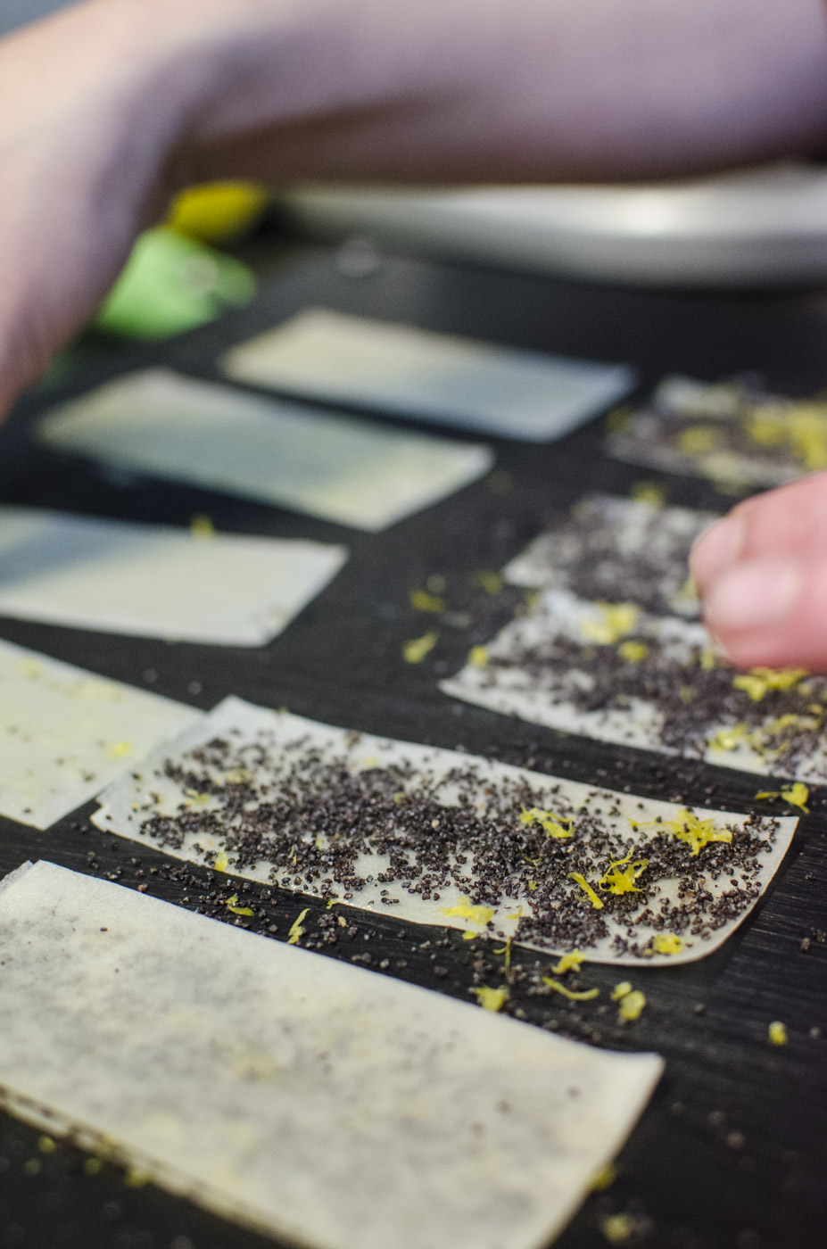 Die geschnittenen Reisblätter mit Ei bestreichen, Mohn und Zitronenzeste bestreuen, fein geschnittener Thymian oder Rosmarin darüber geben und bei 175°C für 4-5 Min. im Rohr backen.