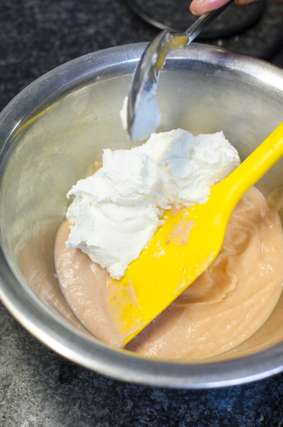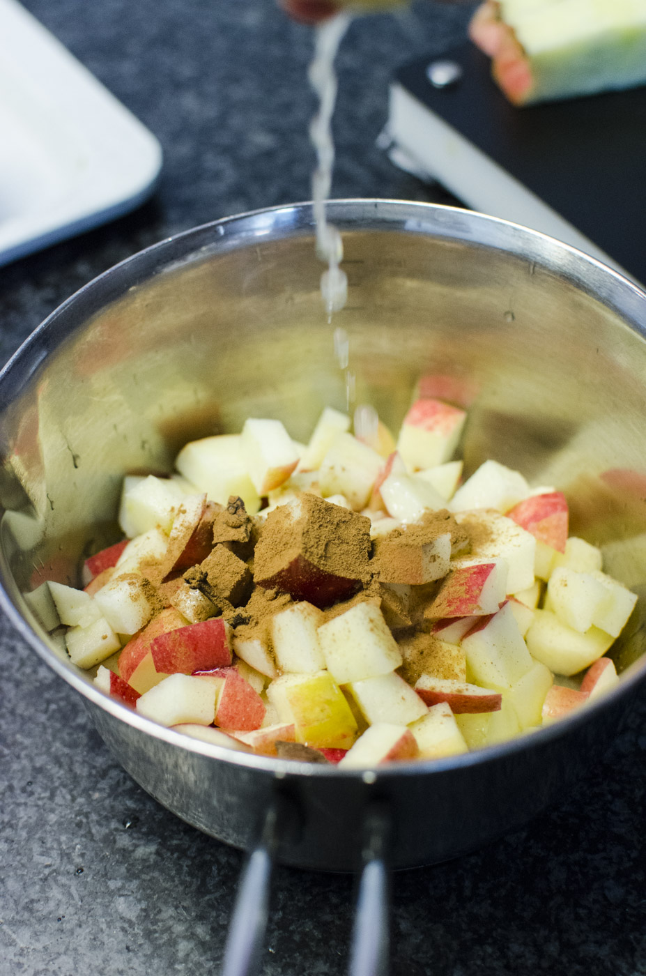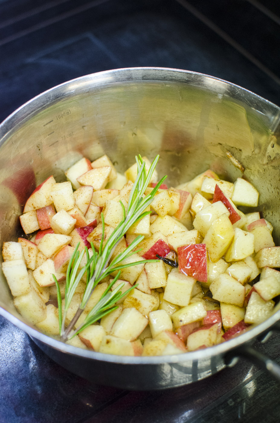 Für die Fülle das Butteröl in einer Pfanne erhitzen, die Apfelstücke mit Schalen in die Pfanne geben, mit Zitronensaft, Agavendicksaft, Gewürzen und Kräuter weich schmoren. Dann den Sternanis herausgeben und mixen. Nun noch fein passieren. Anschließend mit Topfen vermischen und kalt stellen.
