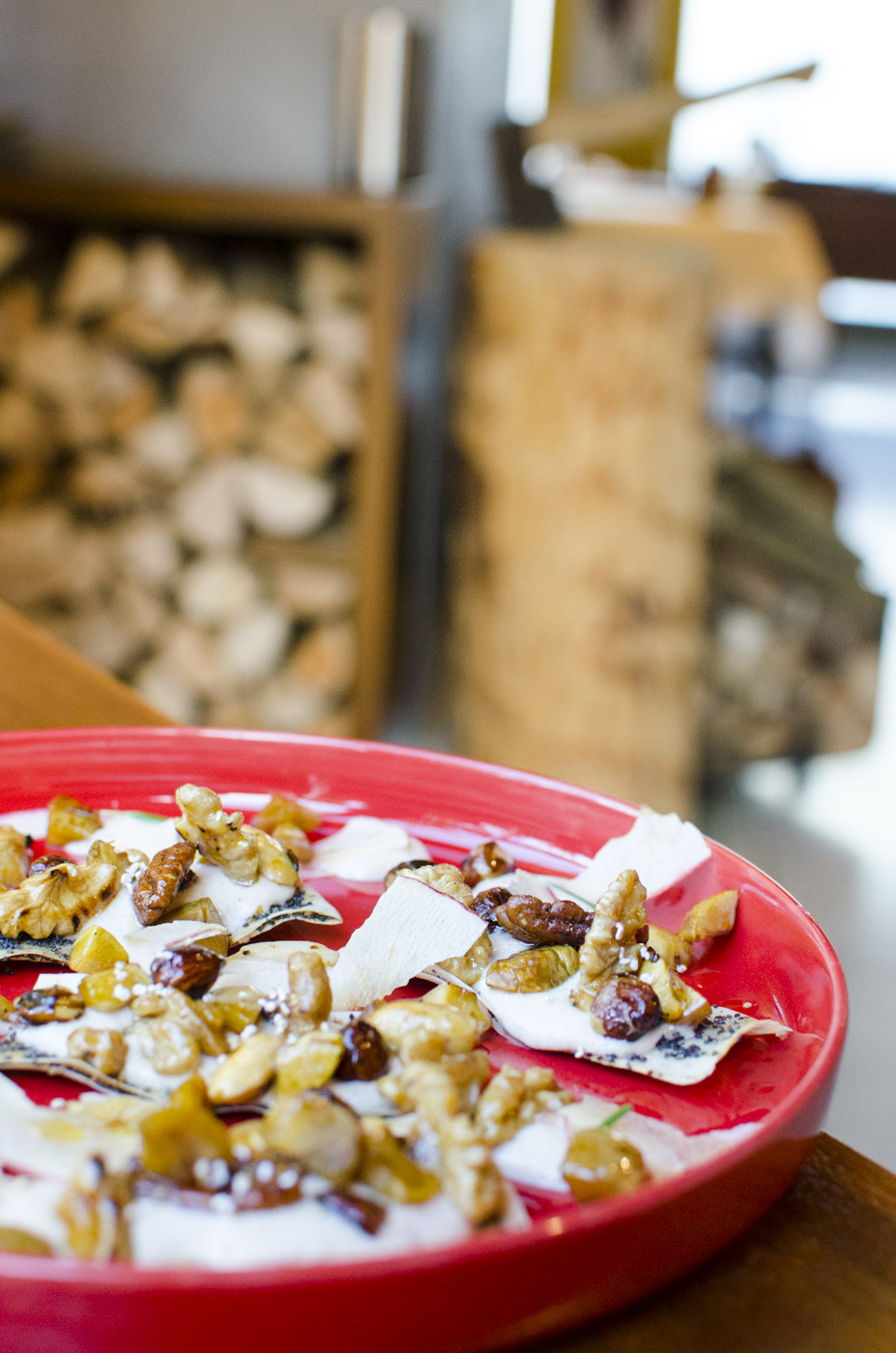 Die Nüsse und ggf. Maroni in einer Pfanne rösten und mit Agavendicksaft glasieren. Dann die Reisblätter und den Topfen übereinander schichten (wie ein Türmchen) und mit den glasierten Nüssen garnieren.