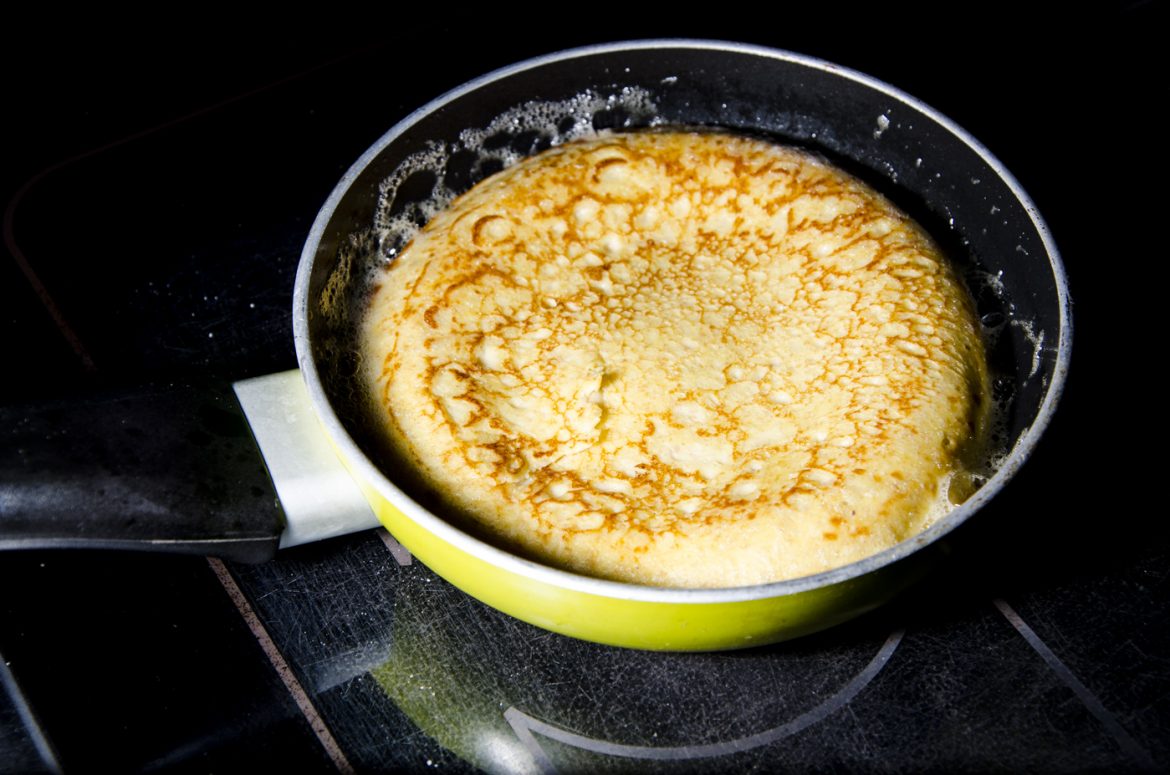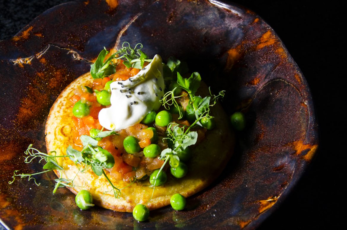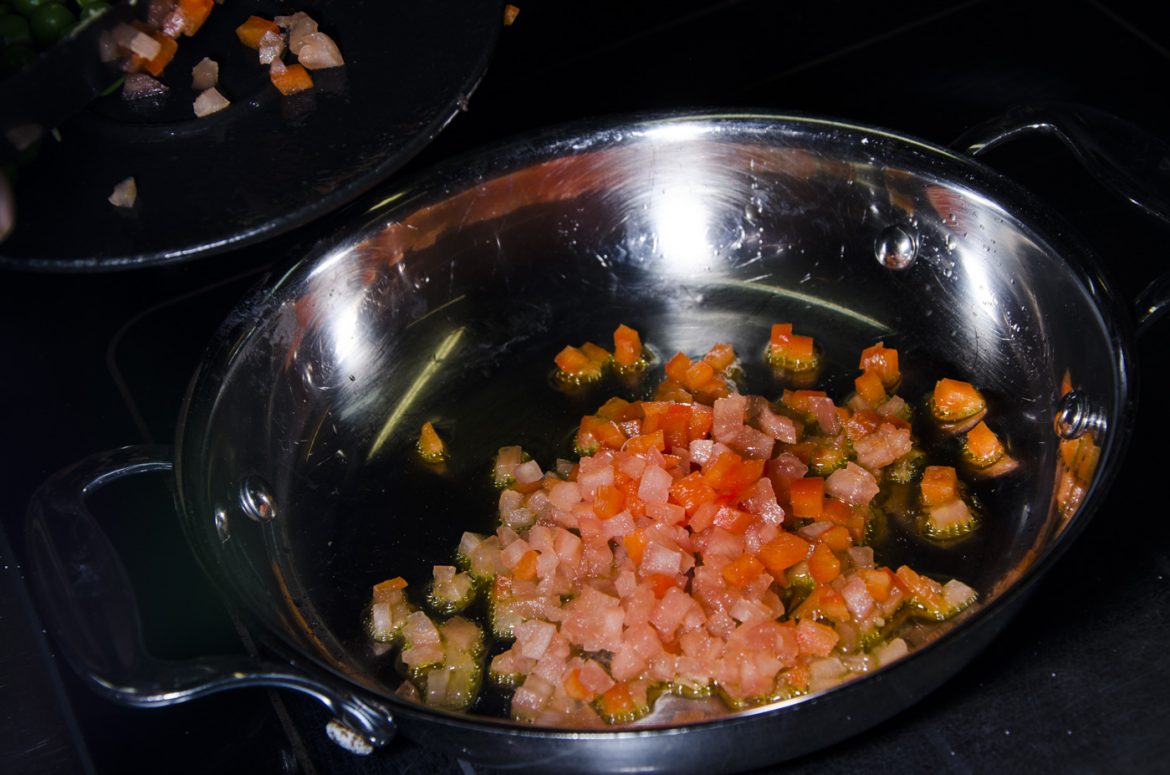 Alle Zutaten verrühren und würzen. In einer beschichteten Pfanne langsam in Olivenöl backen. Für das Gemüse die Tomaten und Paprika schälen und je nach belieben schneiden. Dann in Olivenöl anbraten und die Erbsen dazugeben. Mit Salz und Pfeffer würzen und etwas gehackten Kerbel und Petersilie dazugeben. Das Gemüse auf dem Pfannkuchen anrichten. Reichlich Olivenöl darüber geben und mit Crème Fraiche, Kresse und Kräutern garnieren.