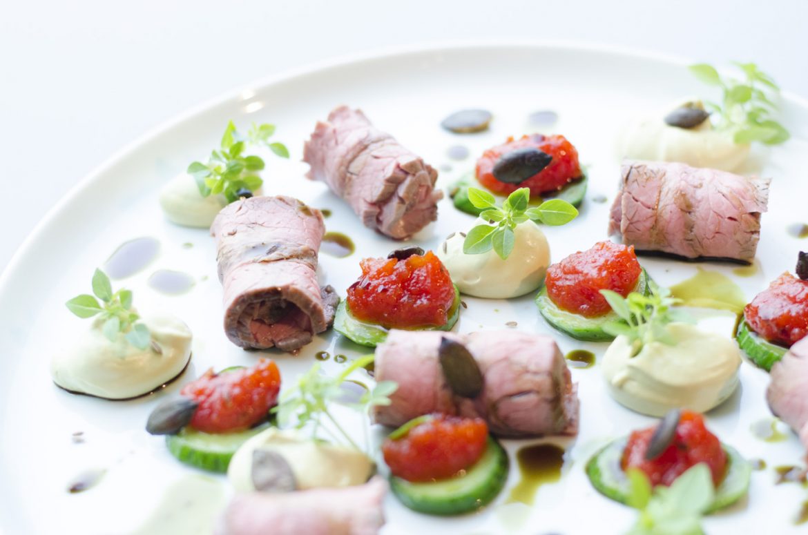 Das Fleisch mit Salz und Pfeffer würzen und von beiden Seiten scharf anbraten. Anschließend bei 175°C 6-7 Minuten lang in den Ofen geben, abkühlen lassen und in dünne Scheiben schneiden. Kleine Röllchen formen und mit ein wenig Olivenöl und Kernöl beträufeln.