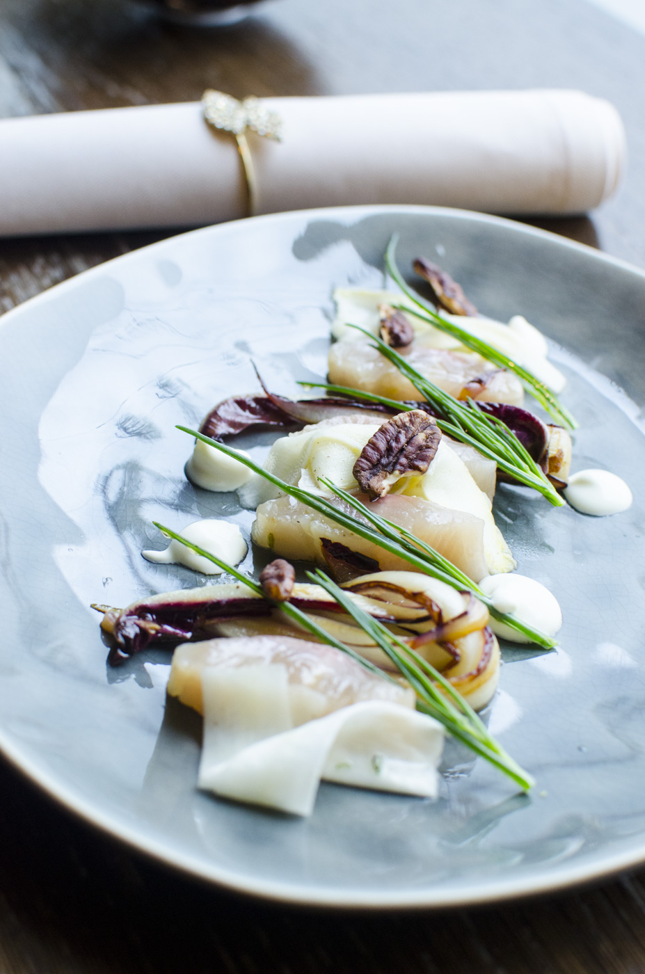 Den Spargel schälen. Anschließend hauchdünne Streifen (längs) mit einer Hobel oder ähnlichem herunterschneiden. Mit Zitronenöl, Salz, Pfeffer, Agavendicksaft und Zitronensaft würzen. Durch die Marinade ist der Spargel roh genießbar und bekömmlich. Den Tardivo vierteln und in Olivenöl anbraten. Mit Salz und Pfeffer würzen und anschließend mit einem guten Balsamico ablöschen. Den Fisch in Scheiben schneiden (ob dick oder dünn) und gemeinsam mit dem Spargel und Tardivo anrichten. Zum Schluss mit gehacktem Mönchsbart garnieren. Fertig ist eine herrliche Frühlingsvorspeise!