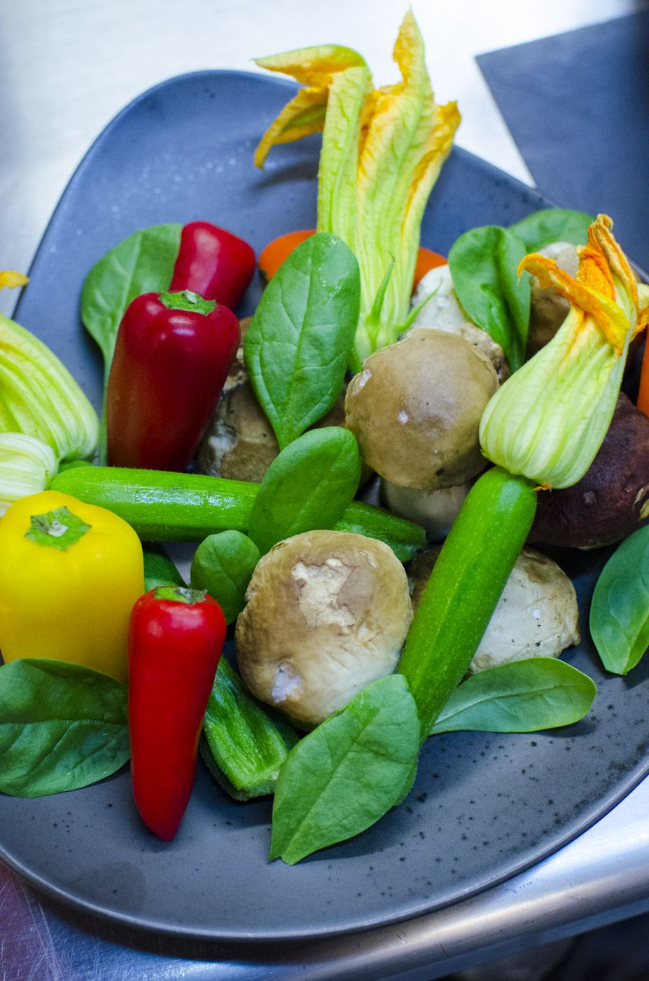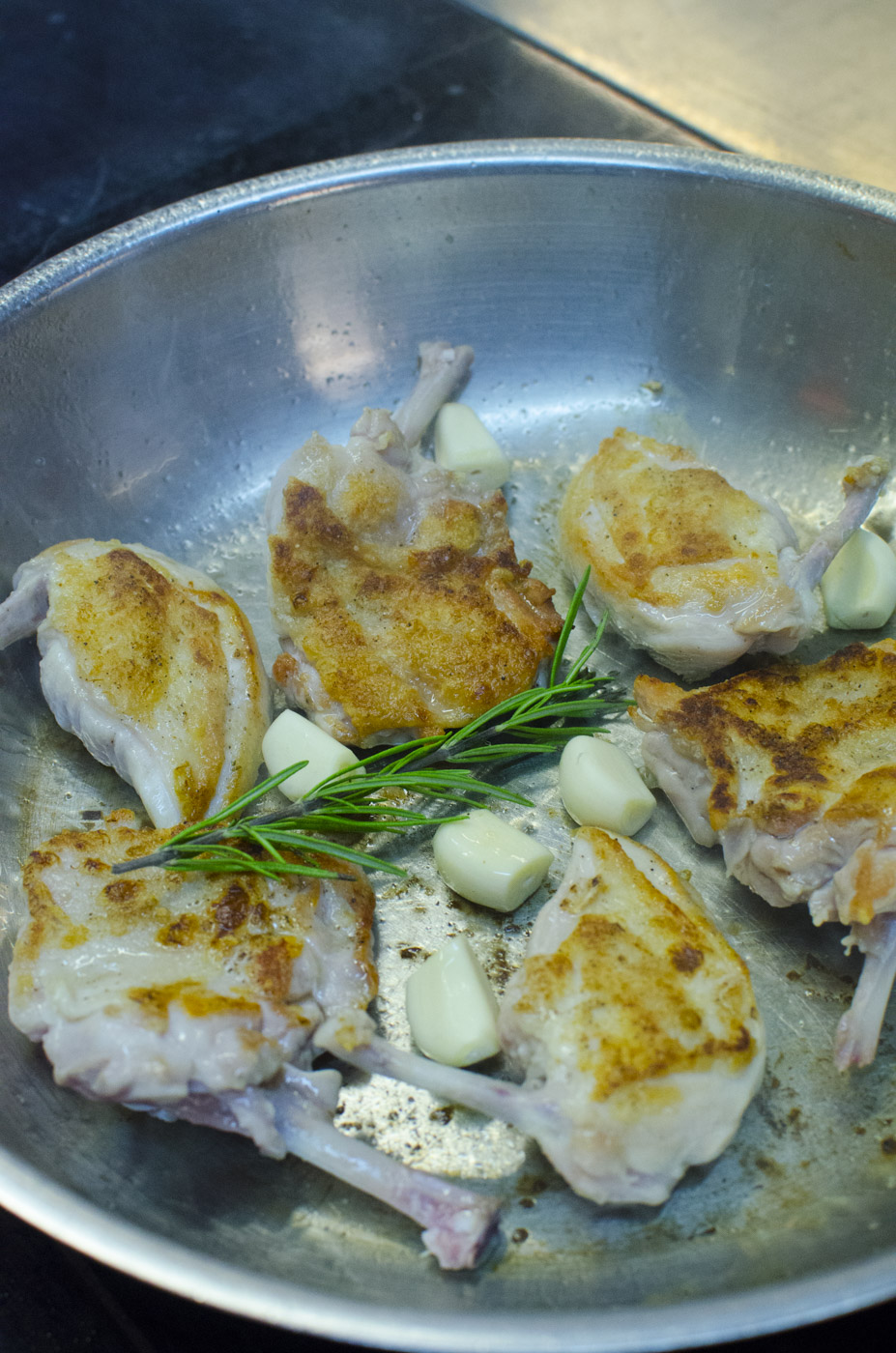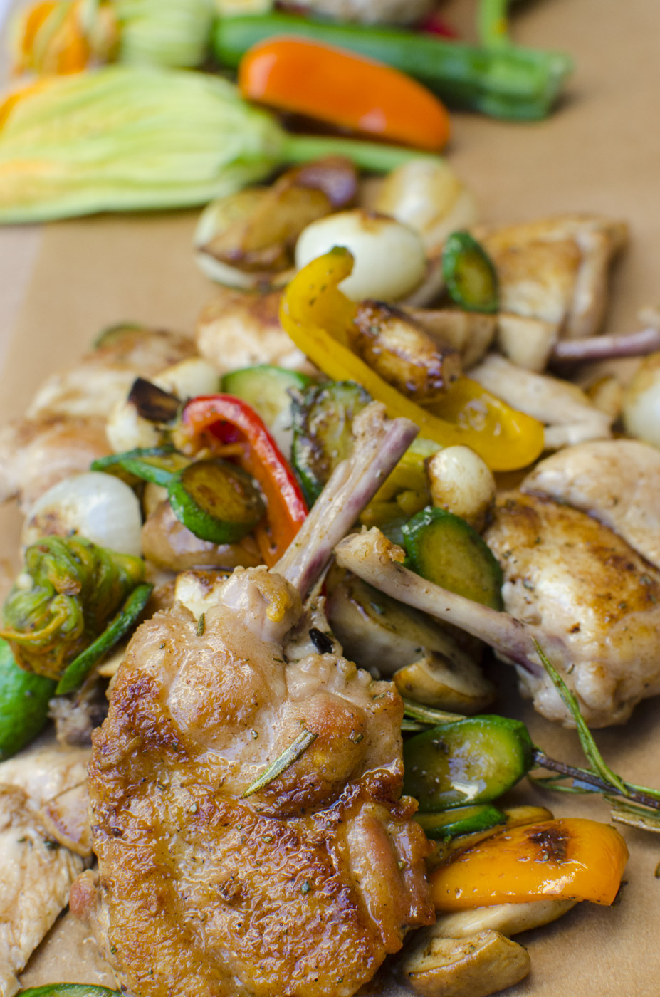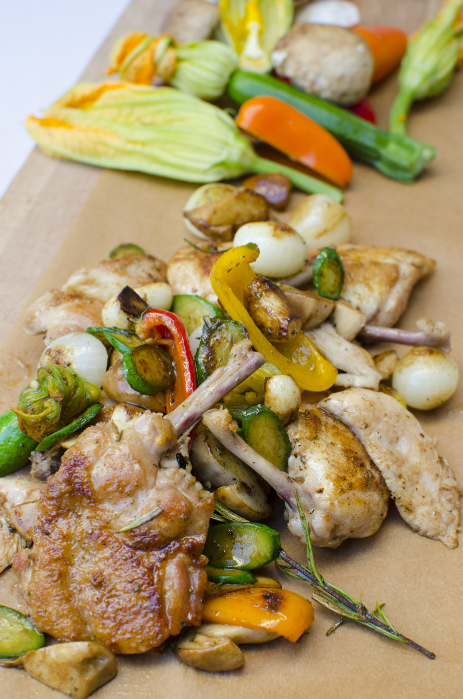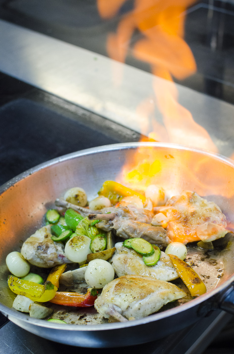Brüste und Keulen mit Salz und Pfeffer würzen und von beiden Seiten in Olivenöl mit den Knoblauchzehen und etwas Rosmarin anbraten (wenn man die Knochen vorher entfernt, lässt sich das Fleisch noch besser anbraten). Die Haut abziehen, zur Seite legen und das Fleisch weiter anbraten. Das Küken dann im Rohr weiterziehen lassen. In der selben Pfanne die Perlzwiebeln (je nach Größe halbieren) mit den geschnitten Paprikastreifen, geschnittenen Zucchiniblüten und Steinpilzen anbraten, bis ein Schmorgemüse entsteht. Mit Salz, Pfeffer, Rosmarin und Agavendicksaft abschmecken. Die Filets und die Haut in die Pfanne dazugeben und gemeinsam mit dem Gemüse mit Cognac flambieren.