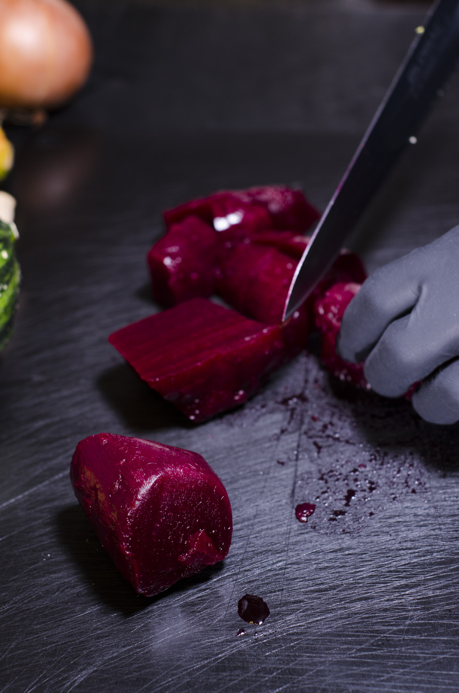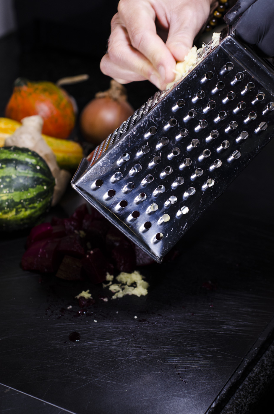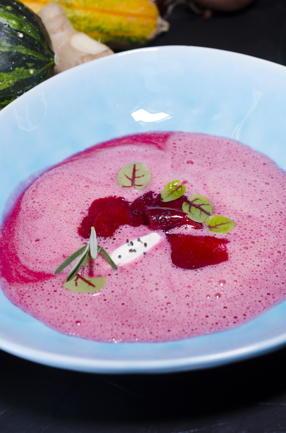Die gekochten roten Rüben klein schneiden, Knoblauchzehen schälen und den Ingwer reiben. Etwas Distelöl in einem Suppentopf erhitzen und die roten Rüben, den Knoblauch und den Ingwer darin gut anschwitzen. Anschließend mit der Gemüsebrühe ablöschen und Wasabipaste, Rosmarin, Agavendicksaft und Reisessig hinzugeben; mit Salz und Pfeffer abschmecken. Jetzt die Suppe einmal gut durchkochen und anschließend in einen Mixer geben. Zum Schluss die Suppe noch einmal durch ein Sieb passieren. Fertig! Tipp: Wer die Suppe gerne besonders schäumig mag, kann die sie noch einmal in einem Topf mit einem Mixstab und etwas zusätzlichem Öl aufschäumen.
