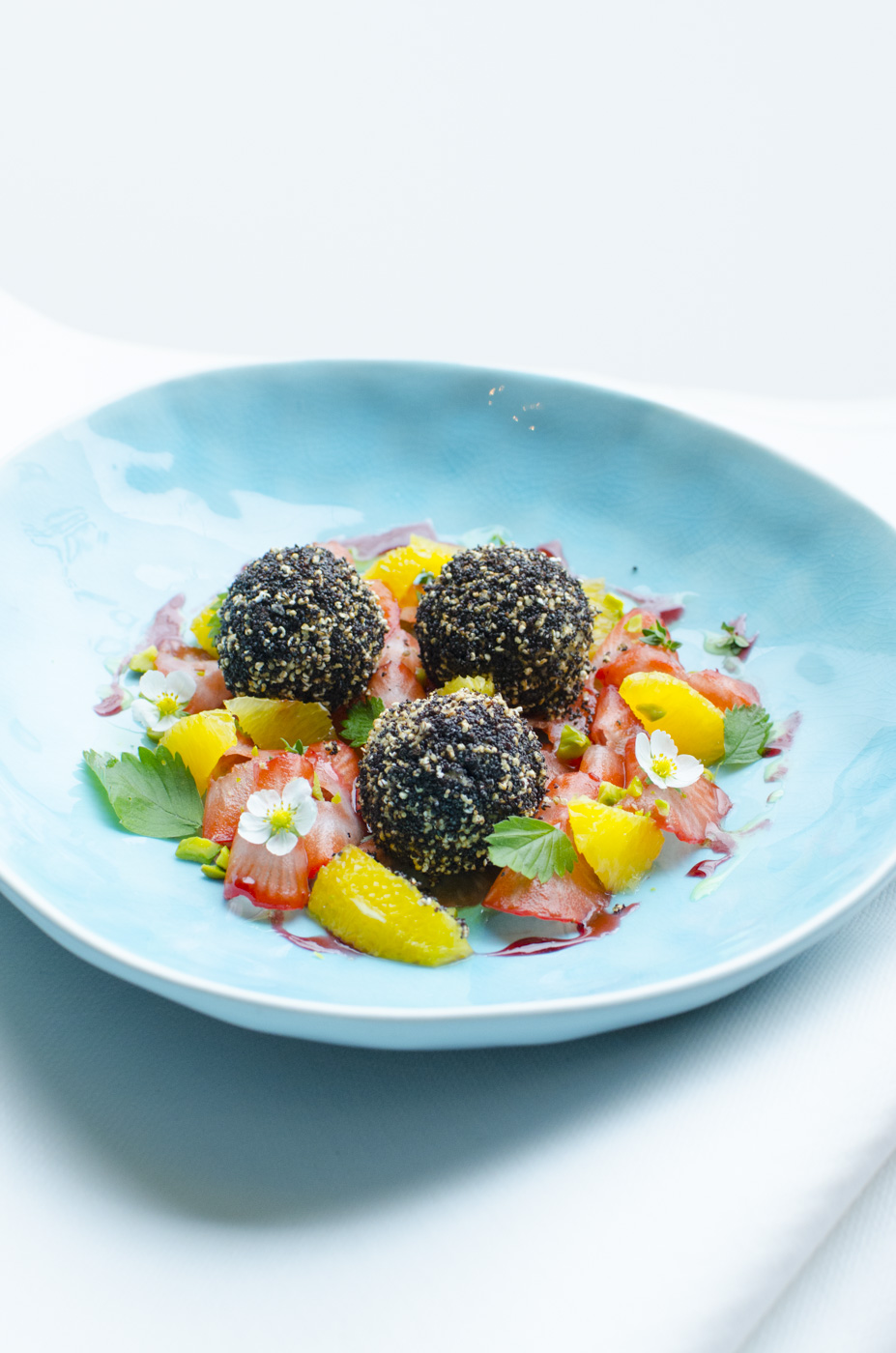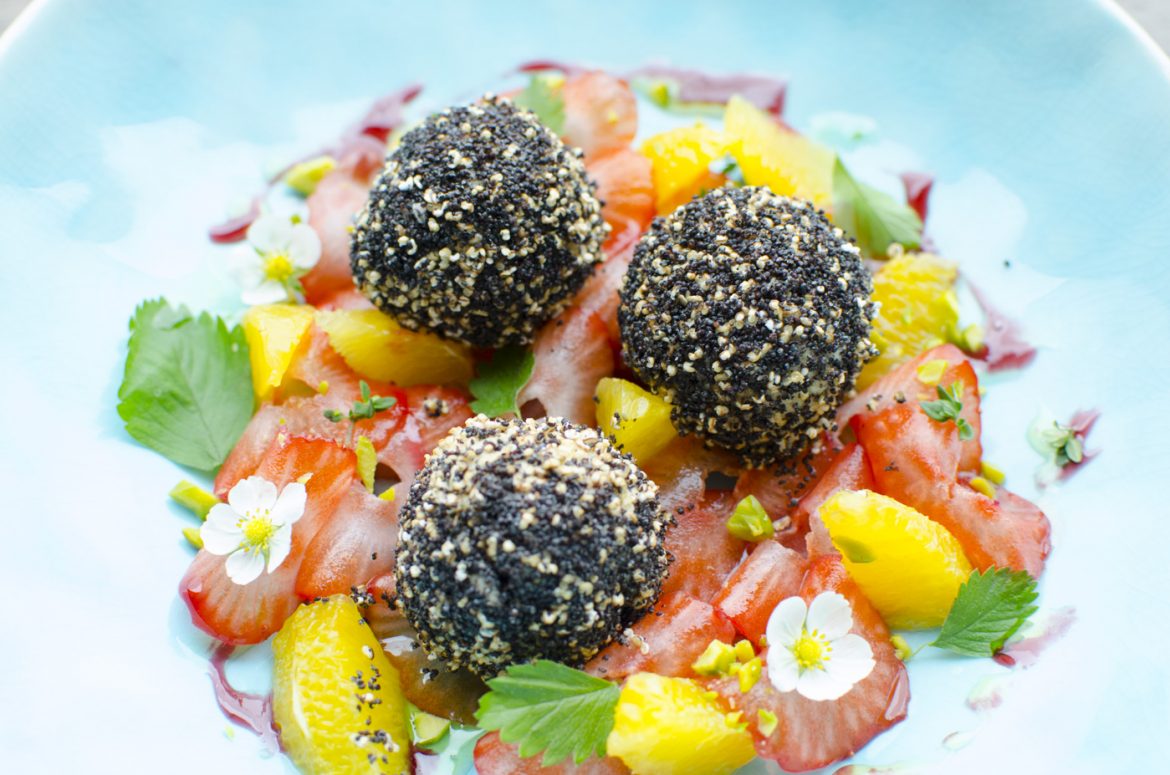 Alle Zutaten bis auf die Erdbeeren und Orangen für den Teig vermischen und mindestens 1 Std. lang kalt stellen. Anschließend die Knödel formen und im kochenden Wasser (mit Agavendicksaft oder Honig süßen) kurz einkochen, dann von der Herdplatte wegziehen, Deckel drauf geben und abwarten, bis die Knödel an der Oberfläche schwimmen (ca. 6-8 Minuten). Anschließend im gerösteten Mohn und Amaranth wälzen. Erdbeeren und Orangen aufschneiden und als Garnitur auf den Teller geben. Bei Bedarf kann noch etwas Zucker über die Knödel zerstreut werden.
