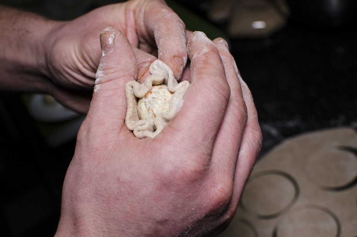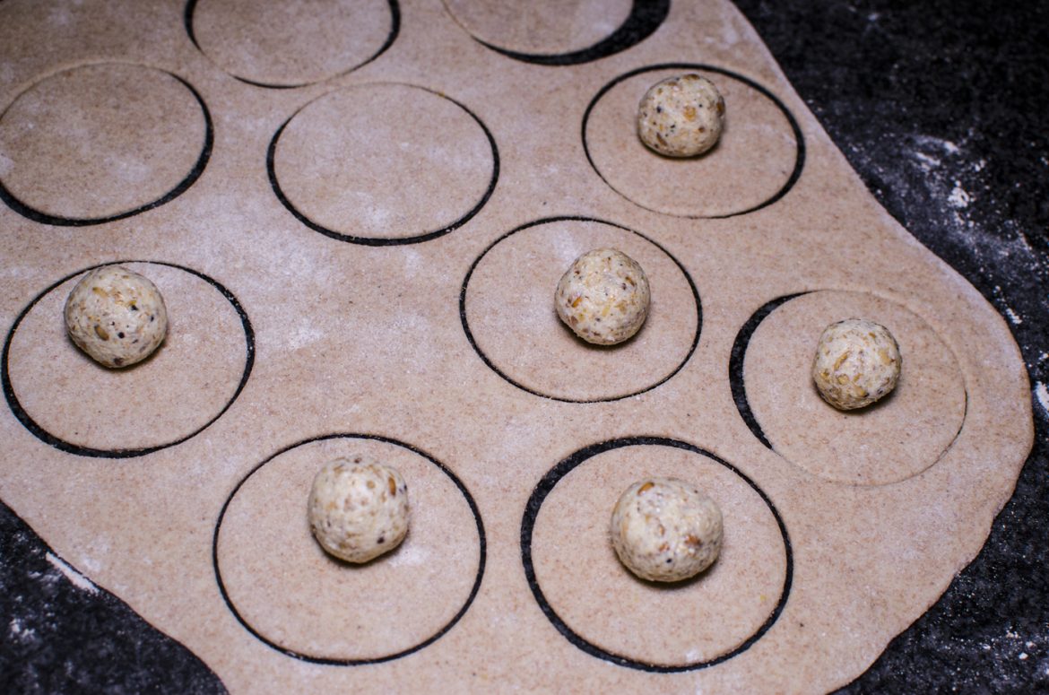 Die Zutaten für den Teig zusammengeben und glatt kneten. Anschließend 1h lang rasten lassen und dünn ausrollen.