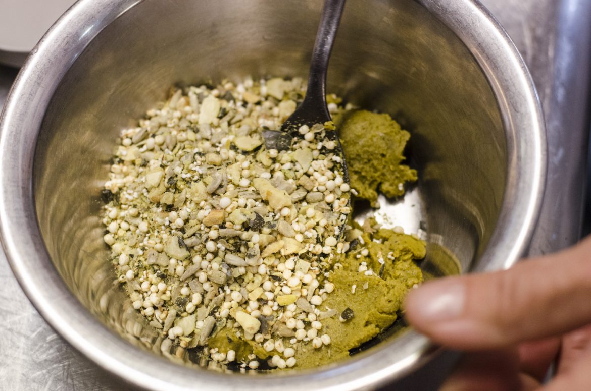 - 150g gemischtes Korn (z.B. Kürbiskerne, Quinoa, Hirse) und geröstete Nüsse