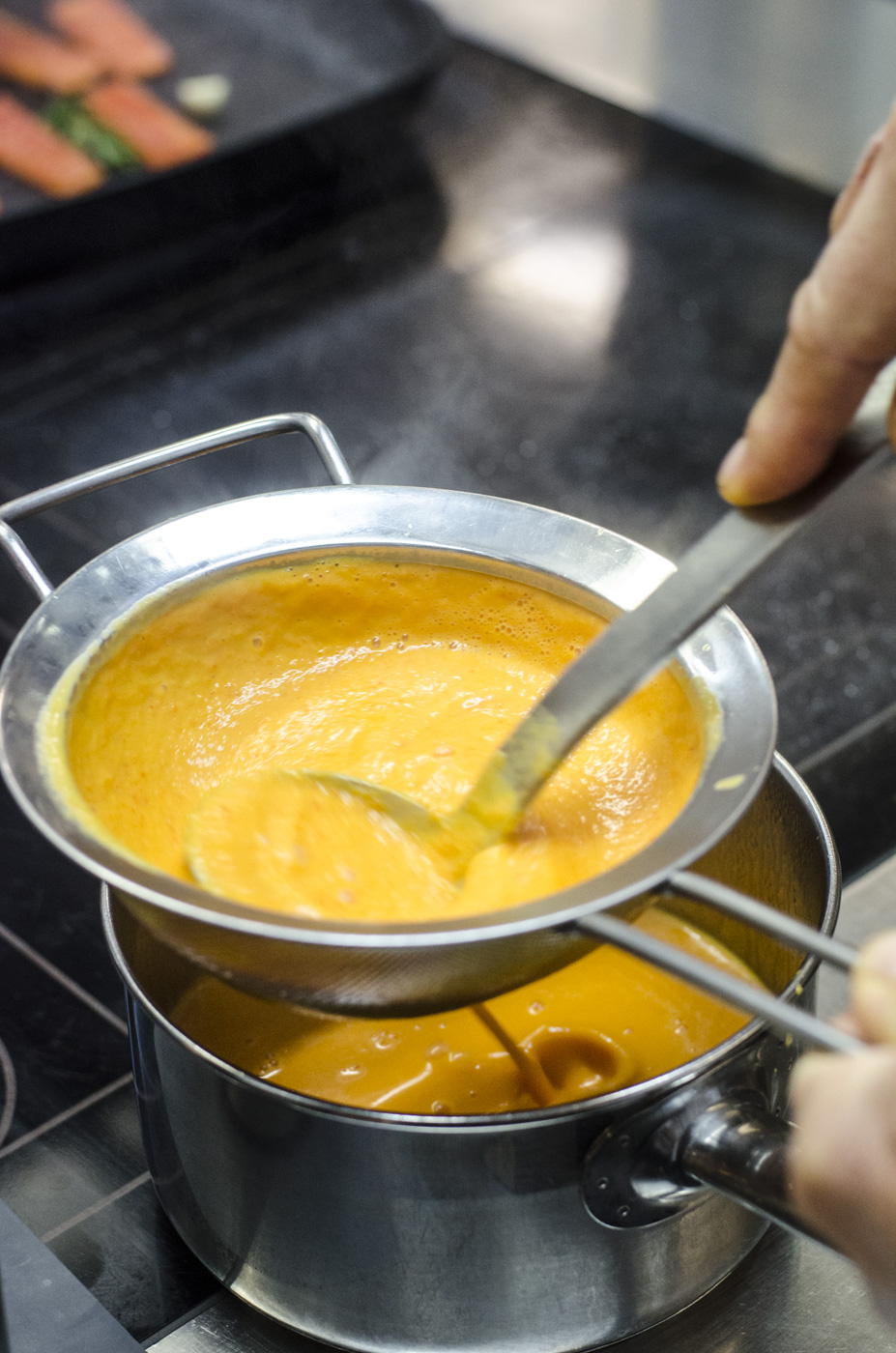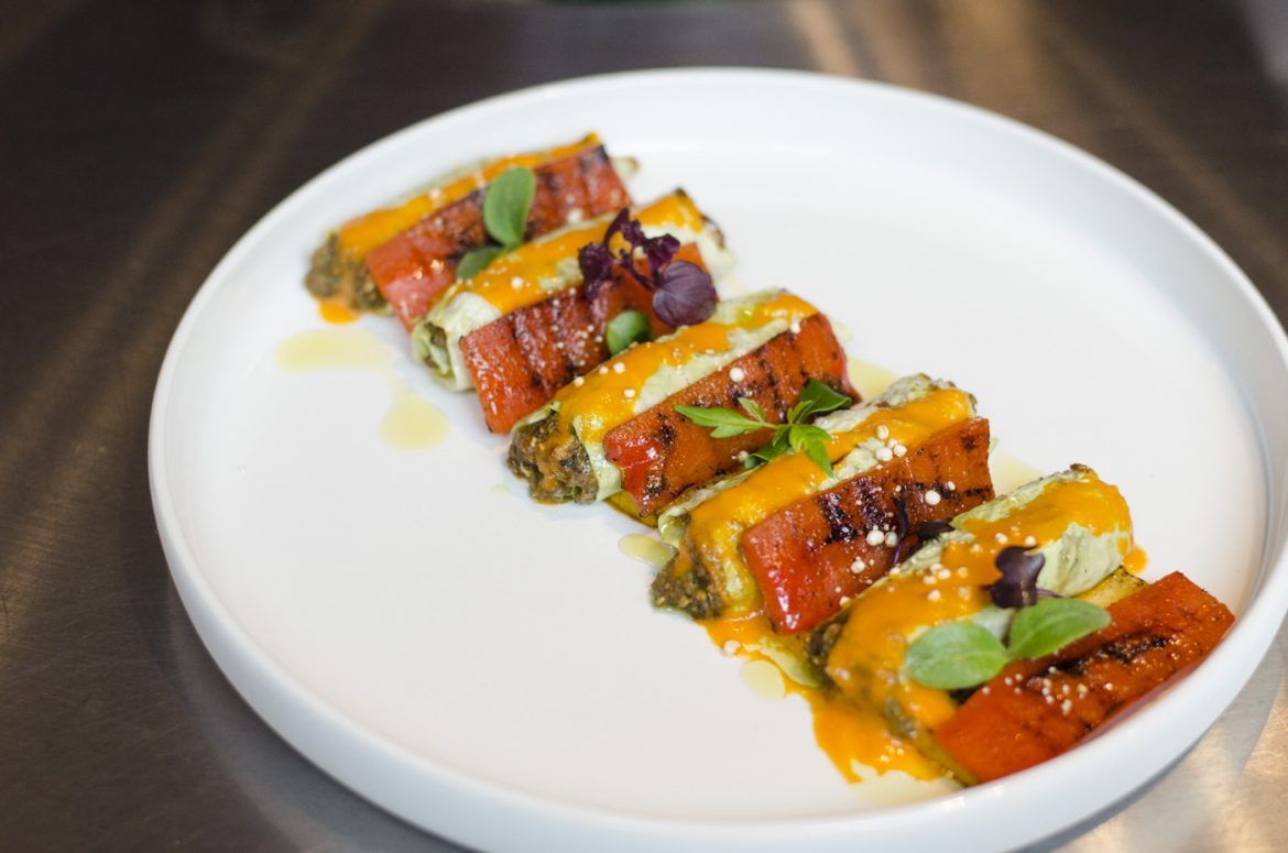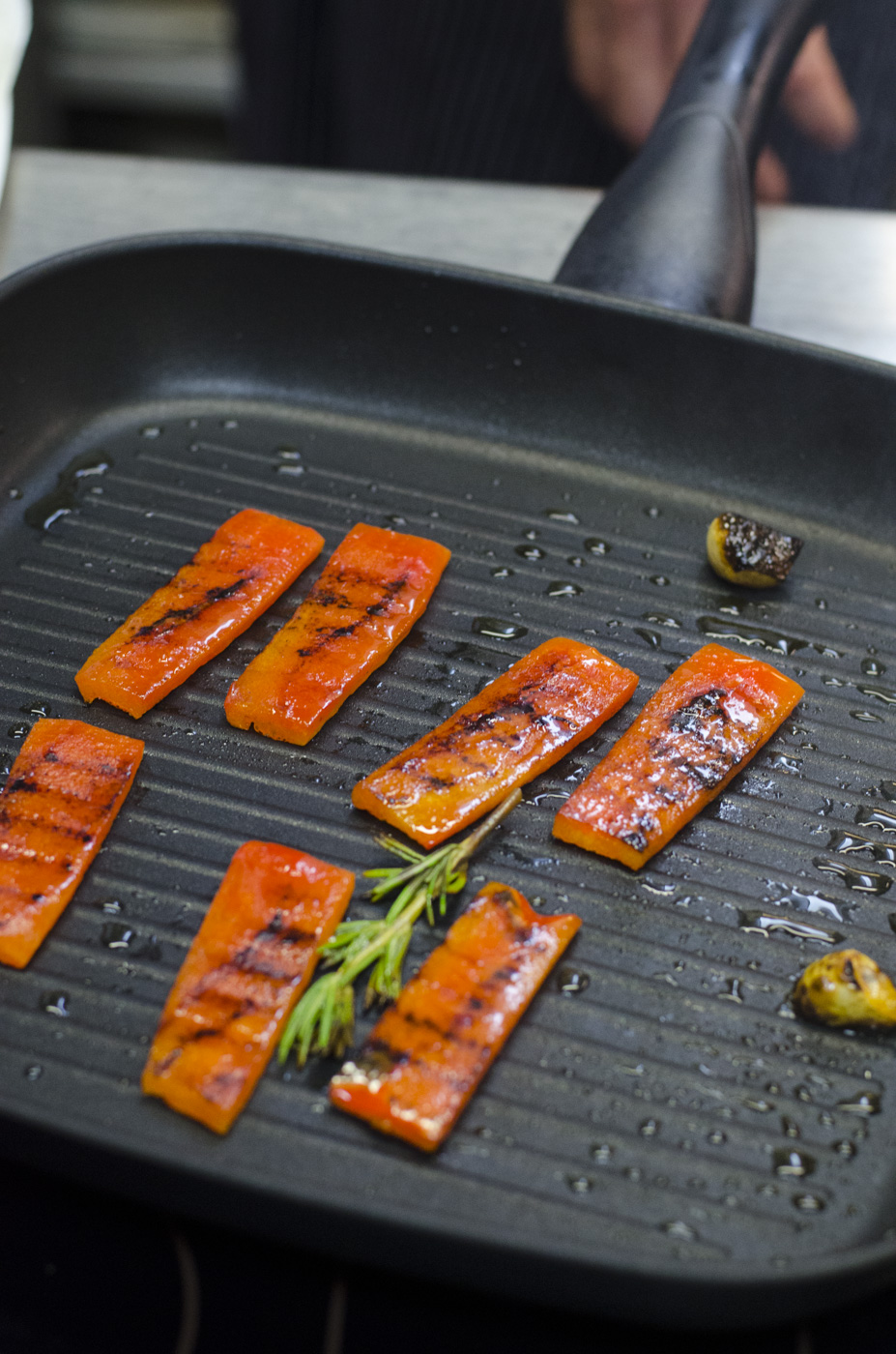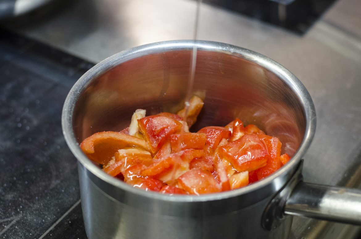 Für das Paprikamark die Paprika schälen, entkernen und in Olivenöl weich schmoren. Mit Agavendicksaft, Reisessig, Salz und Pfeffer würzen, dann mixen und passieren.