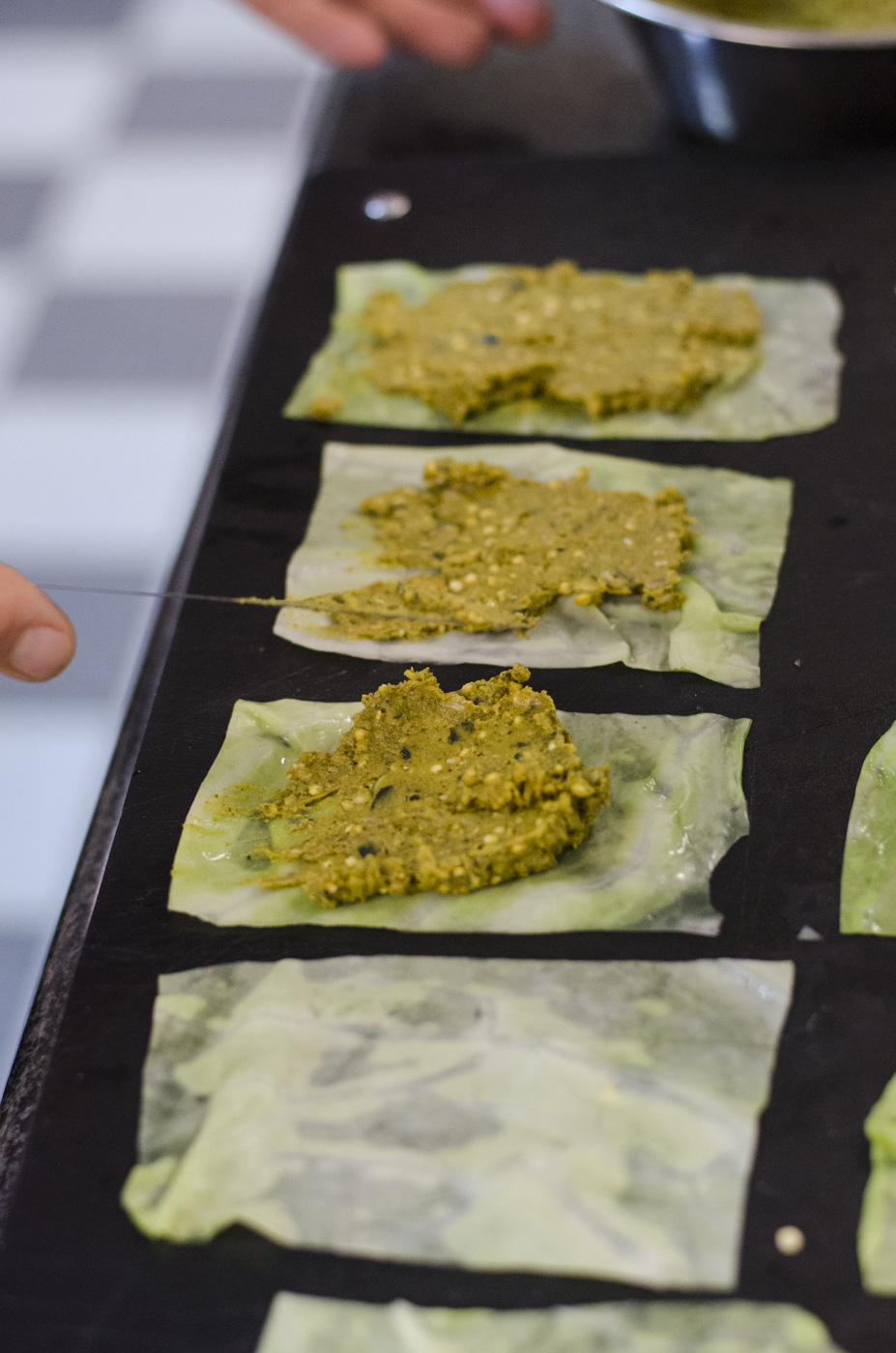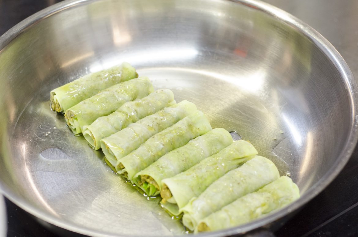 100g Linsencurry (auf Zimmertemperatur) mit den Cerealien vermischen, die Krautblätter kurz blanchieren und die Fülle darauf streichen (siehe Foto). Nun die Rollen in eine Auflaufform oder in eine Pfanne geben, mit Olivenöl beträufeln und für 5-6 Minuten bei 150° in den Ofen geben.