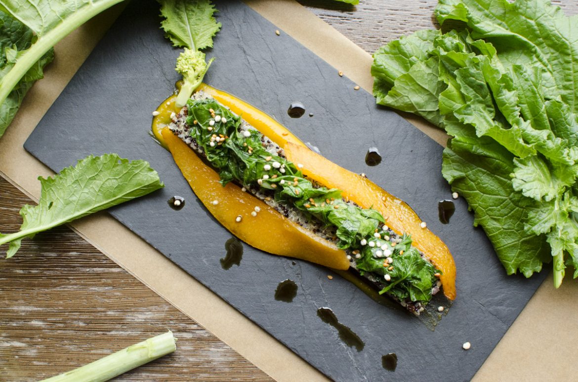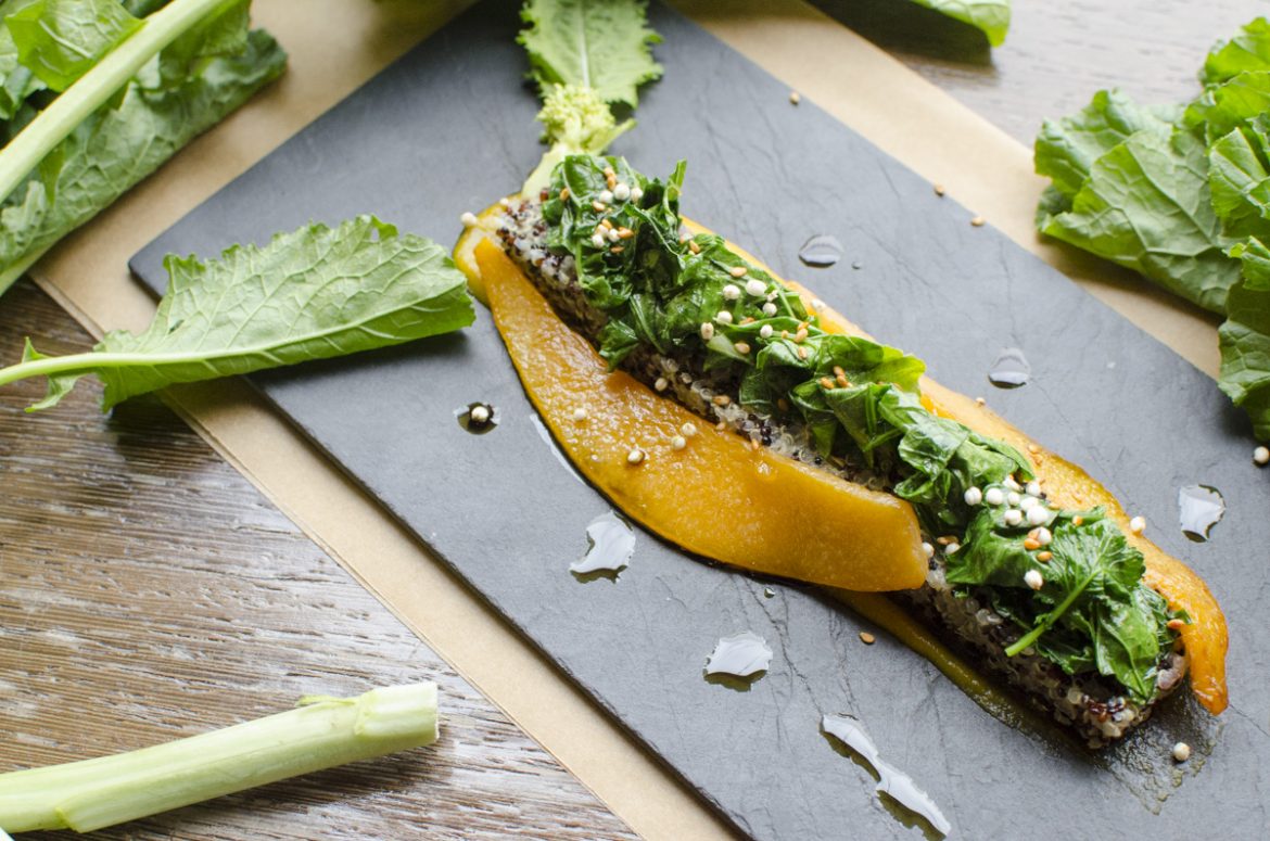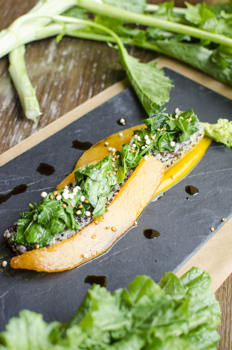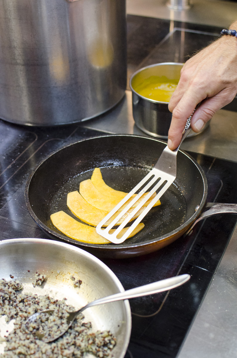 Den Quinoa in Salzwasser kochen und anschließend mit dem Essig und den Gewürzen abschmecken. Den Kürbis waschen, schälen, entkernen, schneiden und mit geschlossenem Deckel weich garen. Dann den Deckel entfernen und etwas Flüssigkeit einkochen.