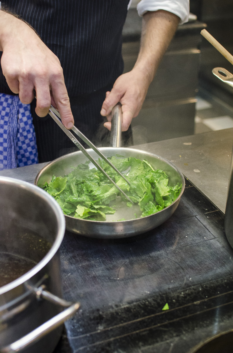 Den Cima di rapa in feine Streifen schneiden, anbraten und mit den Gewürzen abschmecken.