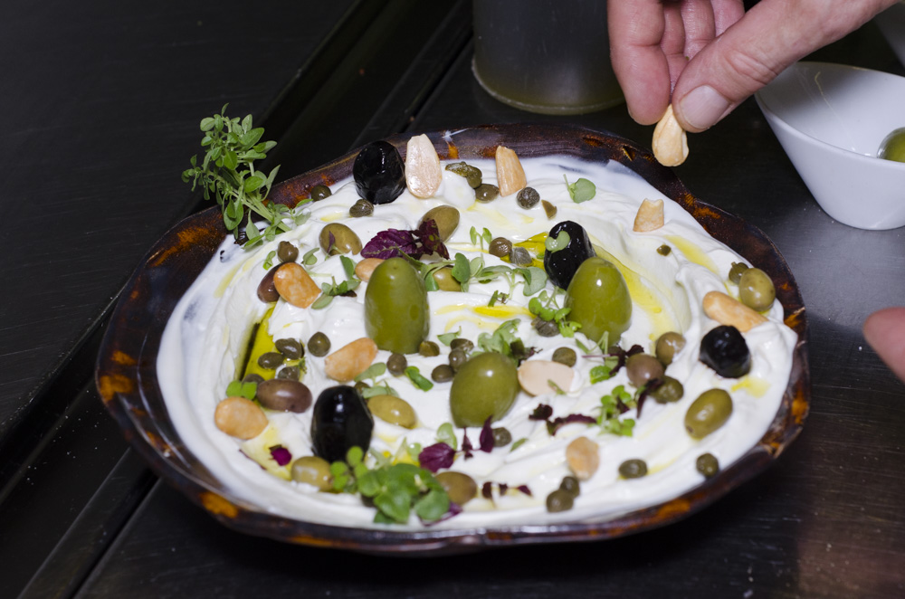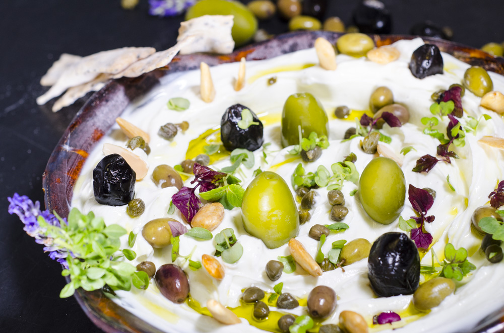 Ziegentopfen mit dem Joghurt vermengen und anschließend Olivenöl, den Oliven, getrockneten Tomaten, Kapern und Nüssen garnieren. Für das Dunkelknäckebrot alle Zutaten zu einem glatten Teig kneten, rasten lassen, dünn ausrollen, schneiden und bei 175°C 8 Min. backen.